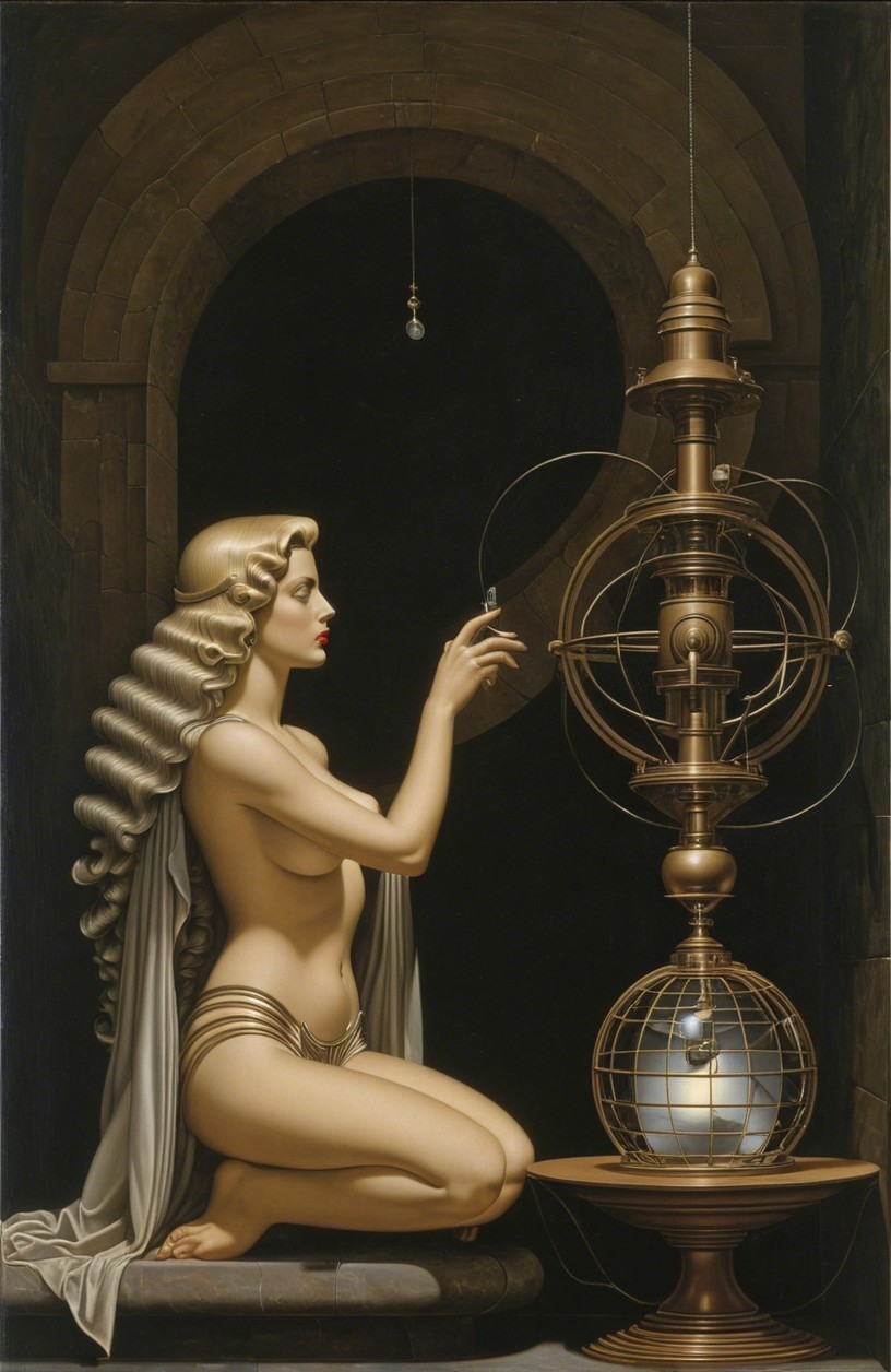 A sensuous figure kneels beside a metallic structure, engaged in an act of contemplation. The artwork blends elements of surrealism and classic beauty, set against a dark, architectural backdrop.