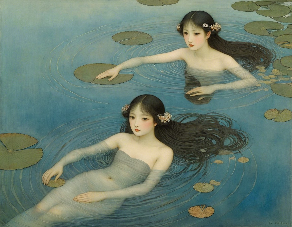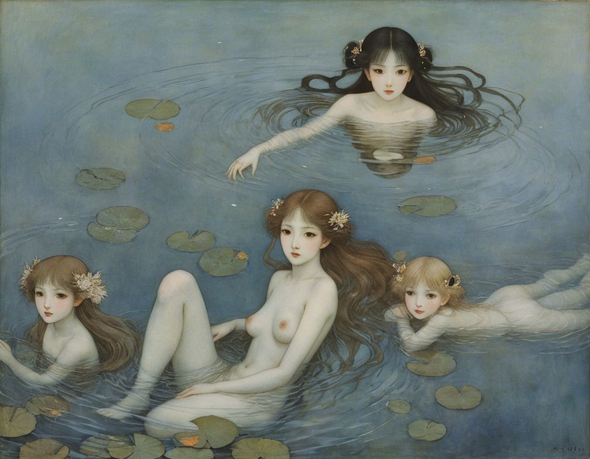 Three ethereal figures with flowing hair emerge from serene water, surrounded by lily pads. Their delicate expressions and enchanting presence evoke a dreamlike, tranquil atmosphere.