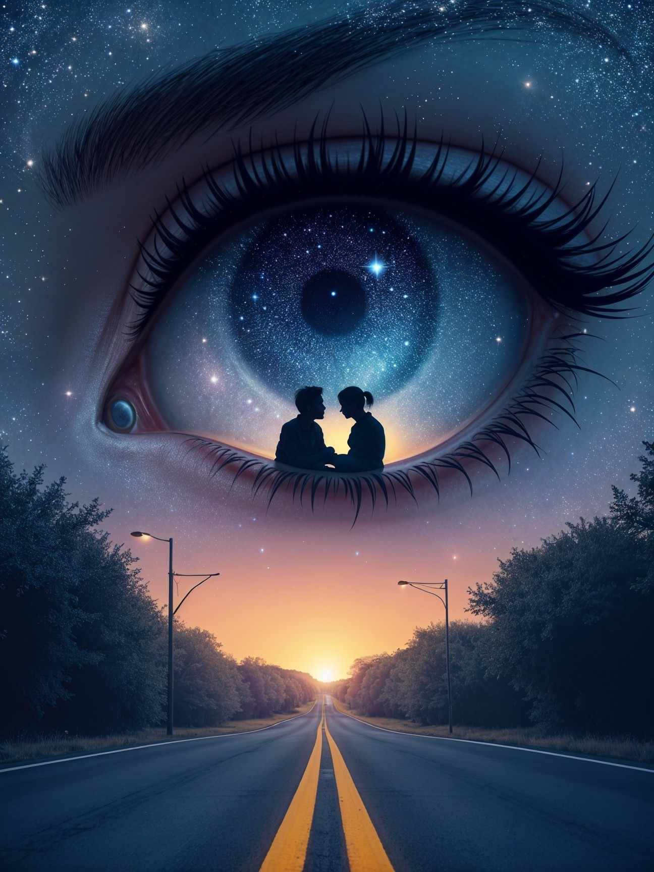 A surreal scene featuring a giant eye reflecting a starry sky, with a couple sitting inside it. A winding road lined with streetlights leads into the night, blending nature and cosmos.