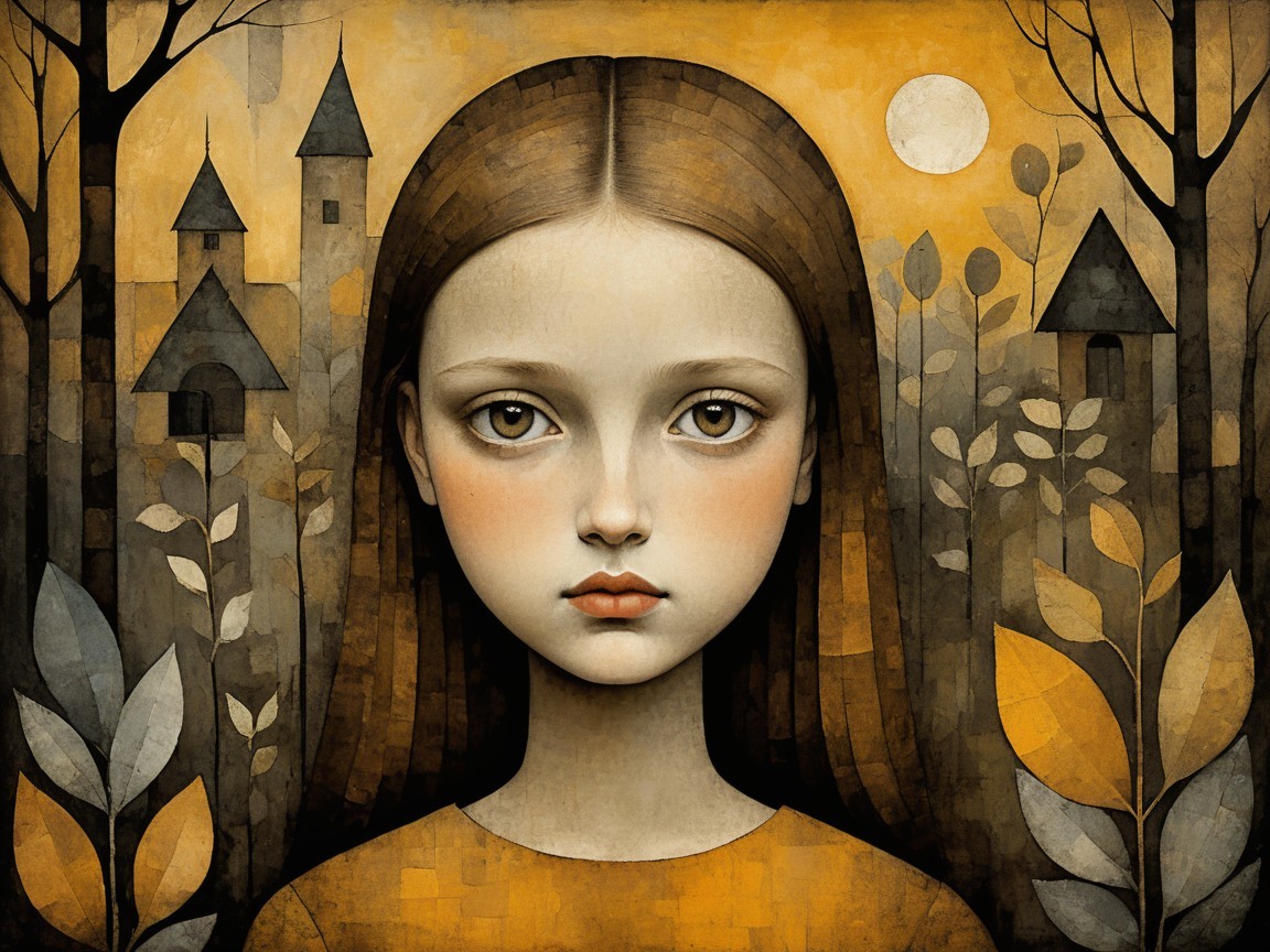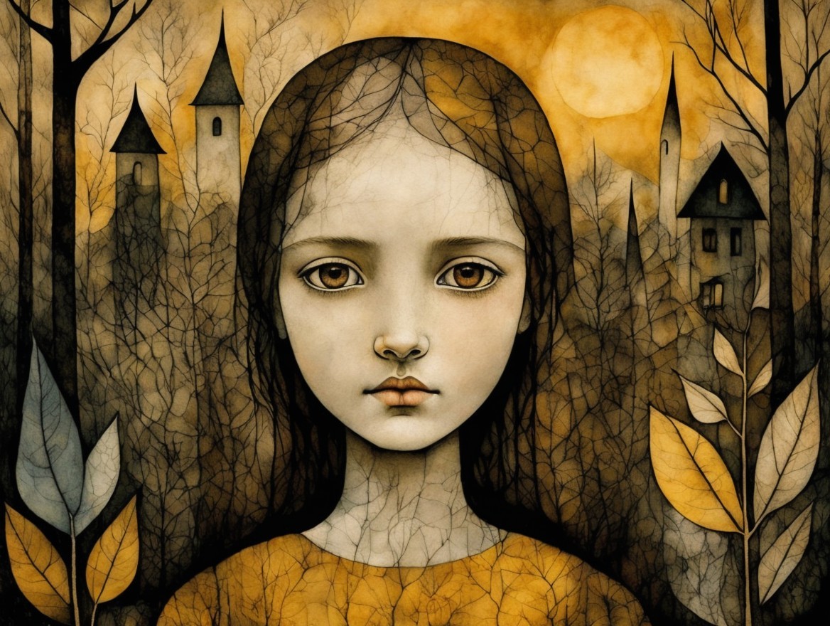 A portrait of a girl with a serene expression, surrounded by stylized leaves and trees in warm, earthy tones. The background features a glowing moon, adding a whimsical touch to the scene.