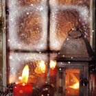 A cozy winter scene features a warmly lit fireplace surrounded by festive decorations, pumpkins, and candles. Outside, a serene snowy landscape with bare trees complements the inviting atmosphere.