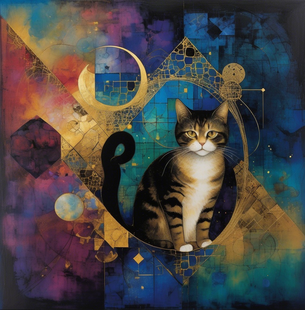 The artwork features three stylized cats—one black, one tan, and one black-and-white—against a vibrant, geometric background of blue, gold, and purple, exuding a whimsical charm.