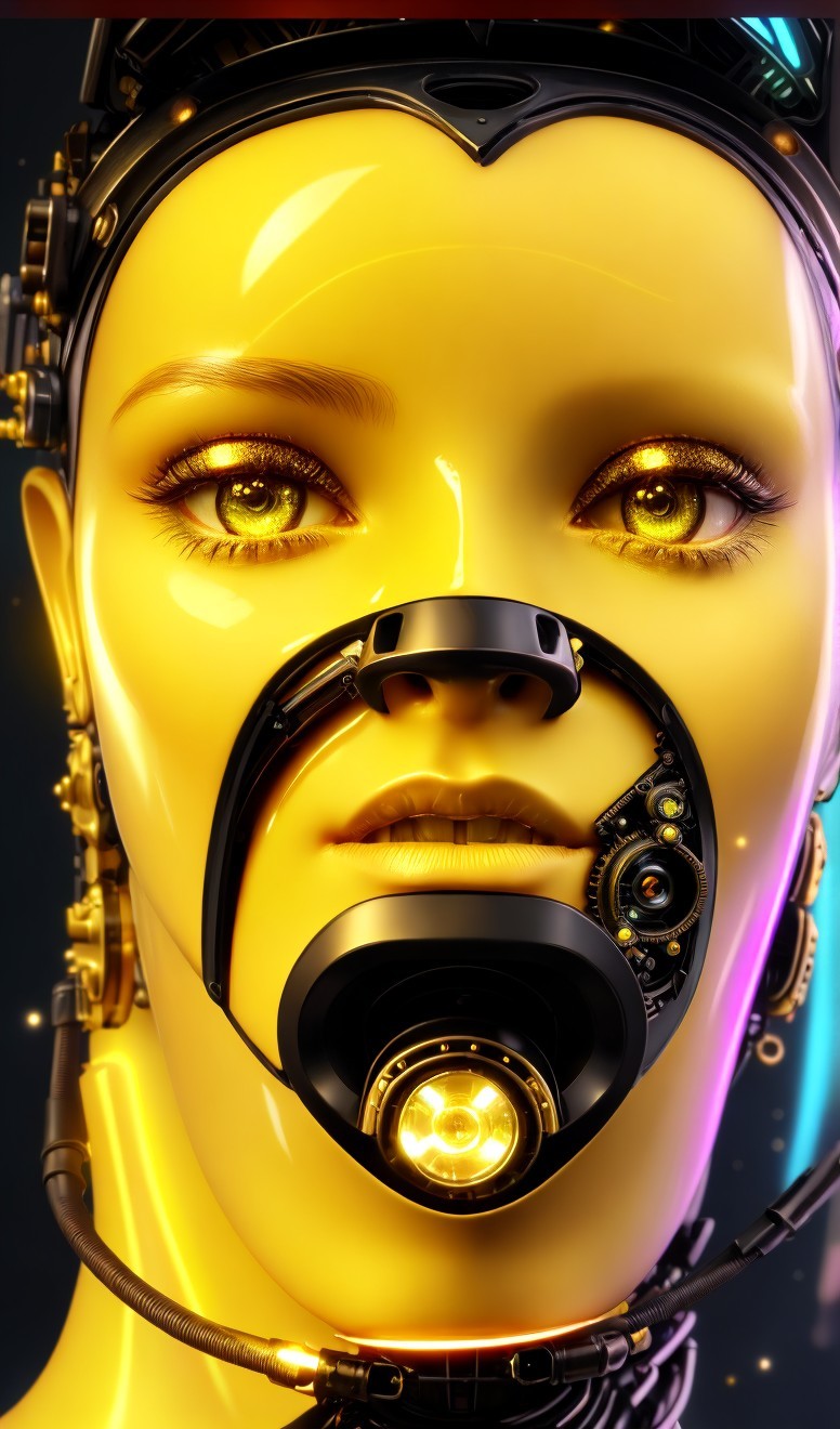 Futuristic robot head with glowing yellow eyes and intricate circuit patterns
