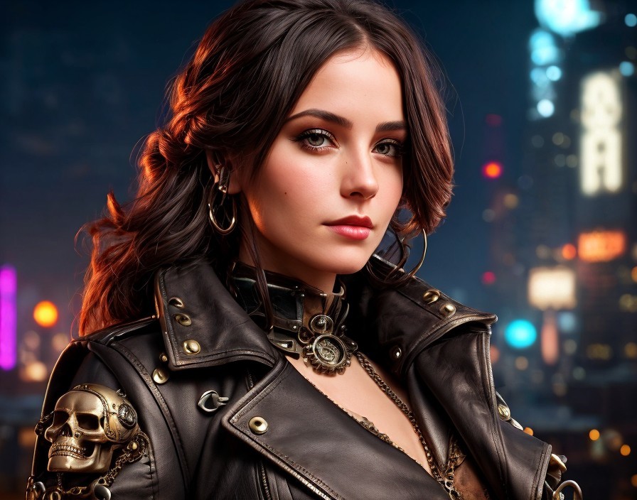 Steampunk woman with cogwheel accessories holding a cog-shaped pipe in front of a gothic city