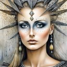 A striking portrait of a woman adorned with a grand feathered headdress, featuring pearls and a blue jewel. Her captivating gaze and bold makeup create an ethereal and powerful presence.
