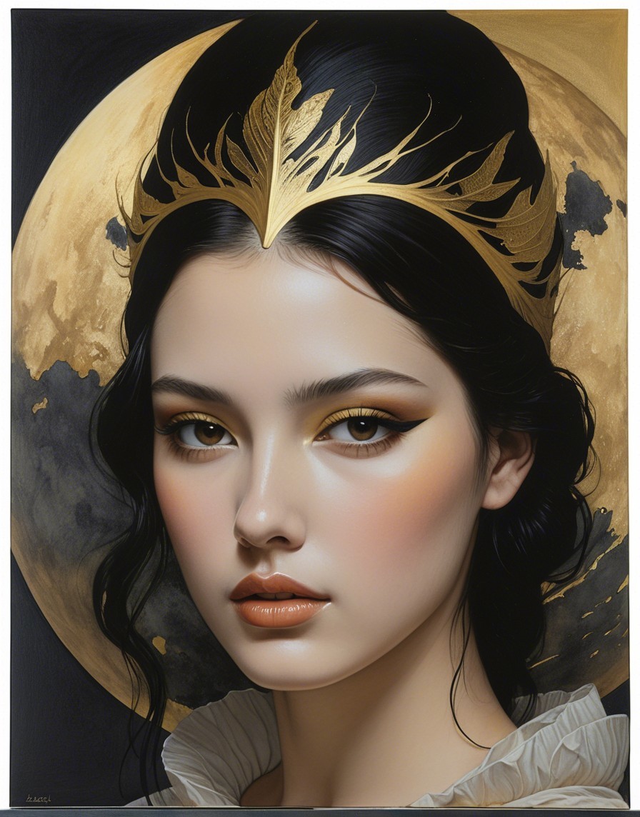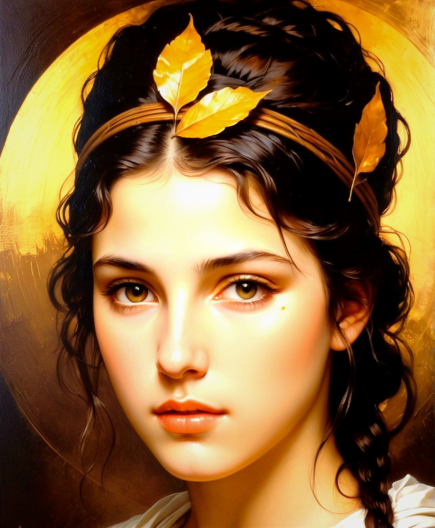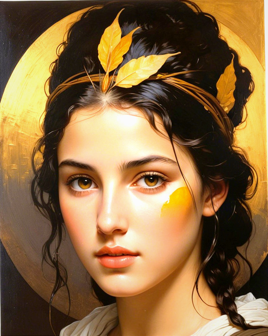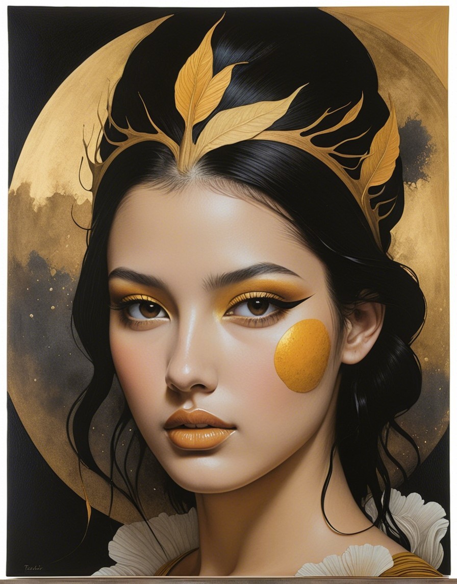 Prompt: Headshot. Wet on wet painting by William Adolphe Bouguereau, hues by Renny Tait and Hugo Pratt, oil blend, airbrush overspray, lighting by Ho Baron, dark fantasy, tonalism, unparalleled detail, paper fibers, soft eroticism, splash ink technique in style of Marc Allante, colorful yam, warm coloring, earth tones, dark-yellow, metallic-honey, classicism reminiscence, hyper-maximalism, soft rounded edges, Pencil and Pastels, ink and alcohol, aquatint merged with aquarelle extrusion, stylized facial features, baked-milk-tones contoured by black ink, micro-pen lines, watercolor effects akin to adorable psychedelic art, Cartoon vintage details by Stan Lee, dethereal, chibli, ((layered paper texture, (vibrant hues, (dark-yellow, light-grey, goldenrut-yellow), highly emotional), 3 layers of dof), 9:13, coherent line-art features),parallax occlusion.128K UHD for crisp quality. Integrate light reflections to add depth for realism and atmospheric feel. Utilize 3D textures and raytraced shadows 1.3 for a drifting, 3-dimensional effect. Implement volumetric lighting for a captivating ambiance. Emphasize vibrant pencil sharp edges, rich textures, and a fusion of geometrical styles with elements of foampunk, uhd, 128k render, visible watercoloring, coherent line-artwork by david graeme Baker and Marc Allante, highly stylized baroque painting merged with fantasy illustration, parallax occlusion, ray-traced shadows 1.2, plasticity 1.3, complexion 1.1, custom_loss:edge, only curves, dynamic lighting 1.7, softened lighting, great depth and scale in brightened tones, american gothic 1.7, rim lighting, impossible light transitions, low key lighting, divisionism, quilling, sculpted, cel-shaded style,vintage style, hdr, VFX-inspired, precise Gelsculpt 64K, novelty architecture, visible skin textures, gradient inking watercolors, asymmentrical geometric lines for realism, rule of thirds, radiance, line-art, HDR, crisp quality, reminiscent of 1970s european comic book art, brightness 1.9,