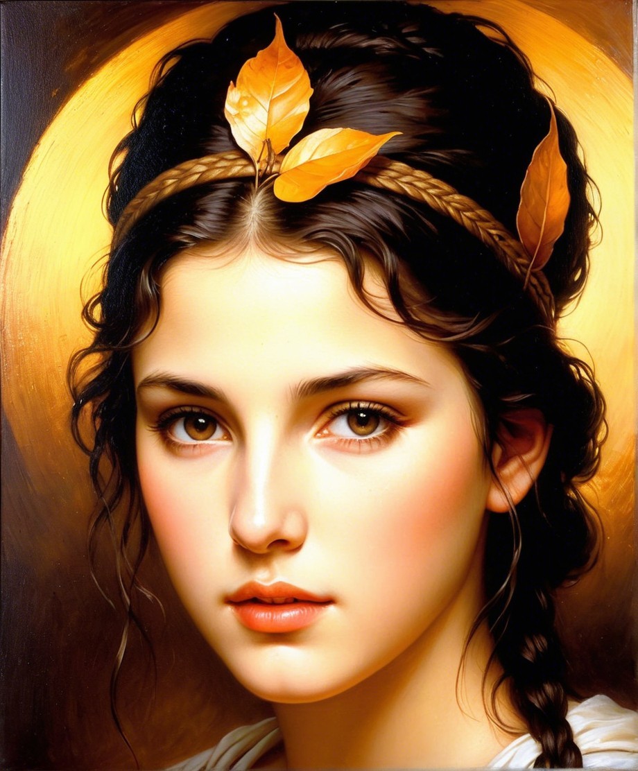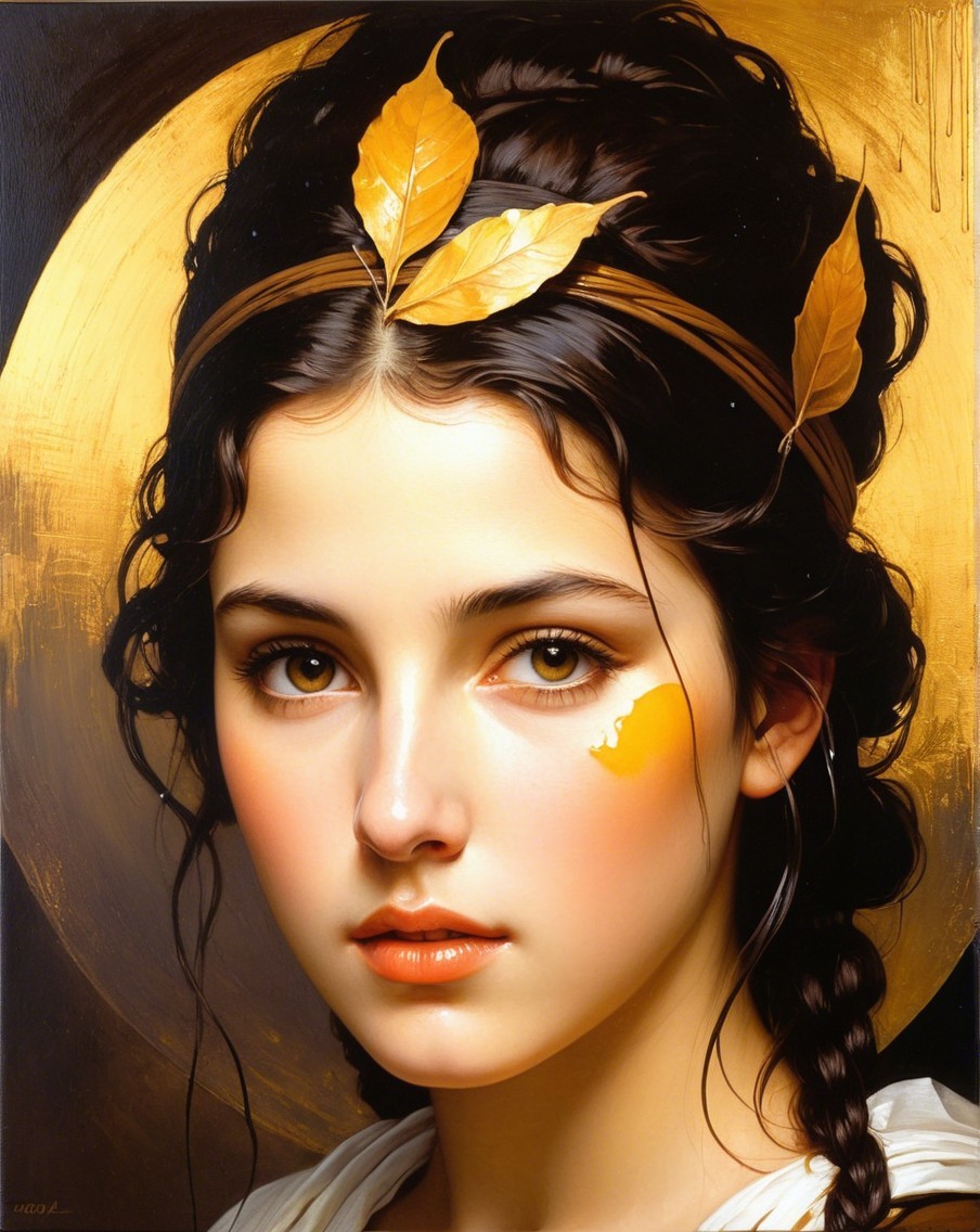Headshot. Wet on wet painting by William Adolphe Bouguereau, hues by Renny Tait and Hugo Pratt, oil blend, airbrush overspray, lighting by Ho Baron, dark fantasy, tonalism, unparalleled detail, paper fibers, soft eroticism, splash ink technique in style of Marc Allante, colorful yam, warm coloring, earth tones, dark-yellow, metallic-honey, classicism reminiscence, hyper-maximalism, soft rounded edges, Pencil and Pastels, ink and alcohol, aquatint merged with aquarelle extrusion, stylized facial features, baked-milk-tones contoured by black ink, micro-pen lines, watercolor effects akin to adorable psychedelic art, Cartoon vintage details by Stan Lee, dethereal, chibli, ((layered paper texture, (vibrant hues, (dark-yellow, light-grey, goldenrut-yellow), highly emotional), 3 layers of dof), 9:13, coherent line-art features),parallax occlusion.128K UHD for crisp quality. Integrate light reflections to add depth for realism and atmospheric feel. Utilize 3D textures and raytraced shadows 1.3 for a drifting, 3-dimensional effect. Implement volumetric lighting for a captivating ambiance. Emphasize vibrant pencil sharp edges, rich textures, and a fusion of geometrical styles with elements of foampunk, uhd, 128k render, visible watercoloring, coherent line-artwork by david graeme Baker and Marc Allante, highly stylized baroque painting merged with fantasy illustration, parallax occlusion, ray-traced shadows 1.2, plasticity 1.3, complexion 1.1, custom_loss:edge, only curves, dynamic lighting 1.7, softened lighting, great depth and scale in brightened tones, american gothic 1.7, rim lighting, impossible light transitions, low key lighting, divisionism, quilling, sculpted, cel-shaded style,vintage style, hdr, VFX-inspired, precise Gelsculpt 64K, novelty architecture, visible skin textures, gradient inking watercolors, asymmentrical geometric lines for realism, rule of thirds, radiance, line-art, HDR, crisp quality, reminiscent of 1970s european comic book art, brightness 1.9,