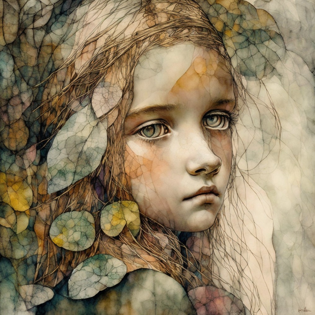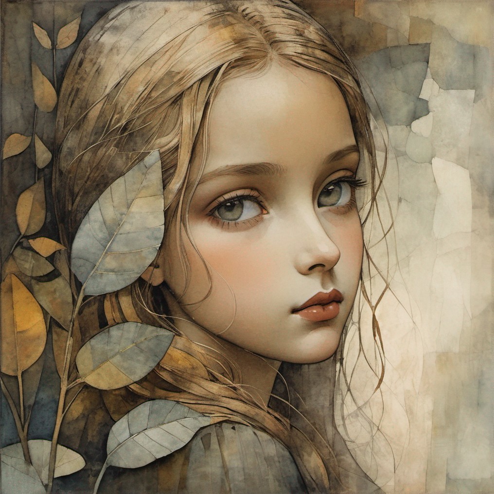 A painting of a young girl with blonde hair surrounded by leaves, rendered with a realistic yet ethereal quality.