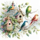 A charming illustration of colorful birds perched on a branch beside quaint birdhouses adorned with flowers. The scene is framed by delicate blossoms, evoking a serene, natural setting.