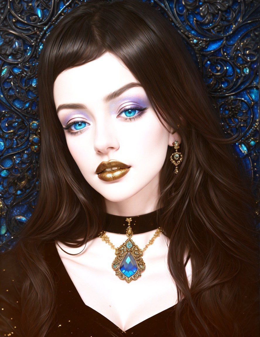 8K 3D Ultra-realistic portraiture with intricate ornamental details, Alcohol ink with gold border, tin foil, beautiful attractive female portrait, iridescent colors, pastel royal blue and  light blue shades, highly detailed, 3D, relief, hdr, 16k black background, detailed hair in stacked lines style, dynamic lighting 1.7, 3d effects 1.8, chiaroscuro lighting, ethereal otherworldly scenery, occult scene, anisotropic filtering 1.7, shadow mapping 1.7, colorful scales, light particles, mist, hues, highly chipped background, embossed flares, bright streaks of black hair
