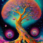 A vibrant, surreal artwork features a majestic tree with swirling branches, set against a cosmic backdrop. Two glowing orbs float nearby, creating a harmonious blend of colors and shapes.