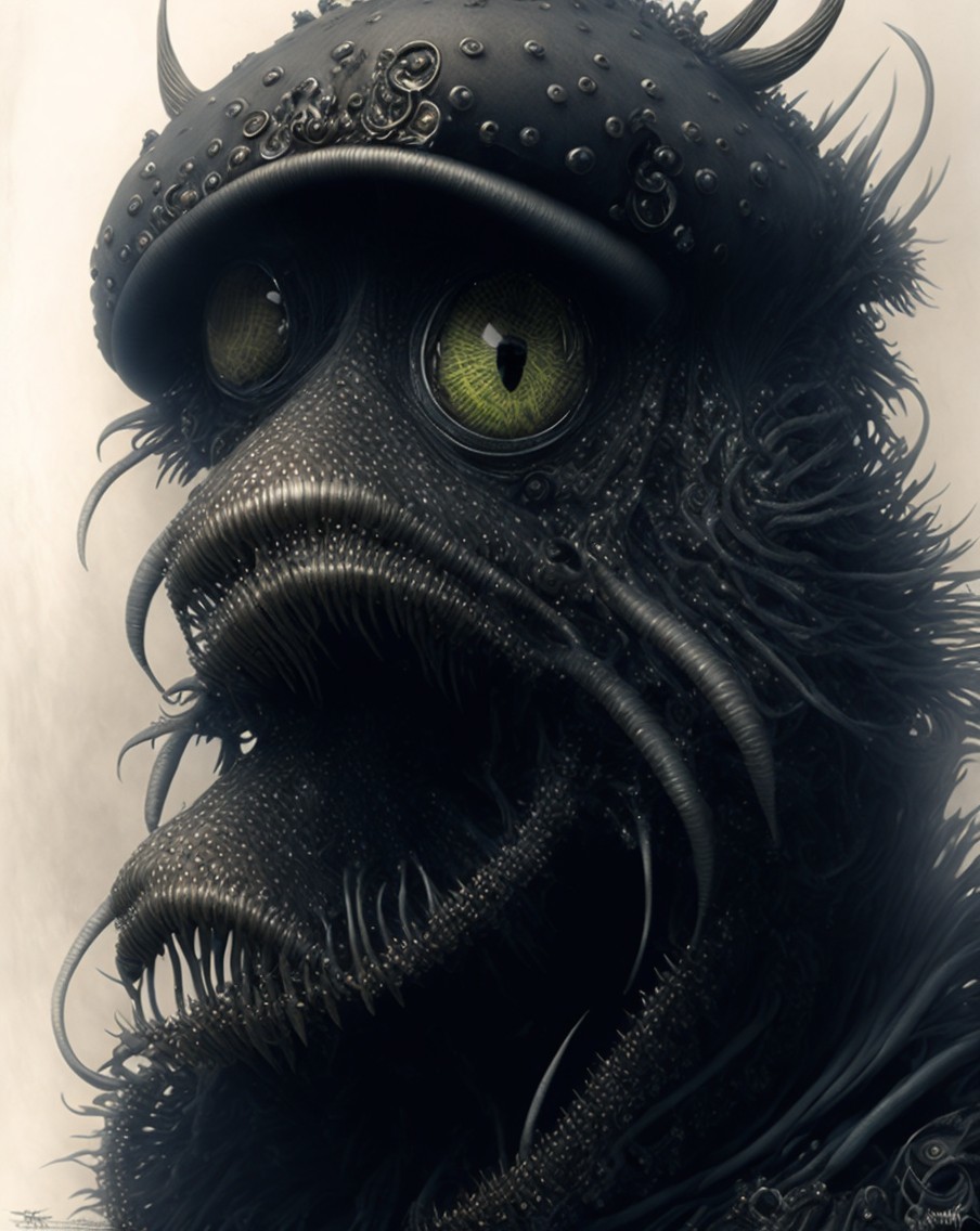 Detailed Monochrome Illustration of Fantastical Creature with Multiple Eyes and Sharp Teeth