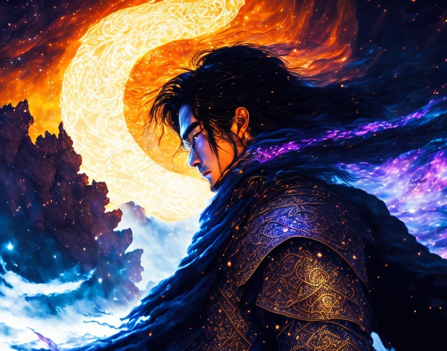 Fast Attack of angry european male spirit of revenge in chainmail and long silk flowing sleeves with fantasy pattern of glowing glyphs, galaxy eternity, vibrant scene, unreal flying clouds, dark landscape, sundown sky, interplay of light and darkness; by Goya, Junji Ito, wei wuxian, Akseli Gallen-kallela, Arkhip Kuindzhi; ink art surrealistic fantasy painting; ink flowing splash art, extreme detail, oil on canvas, soft brush