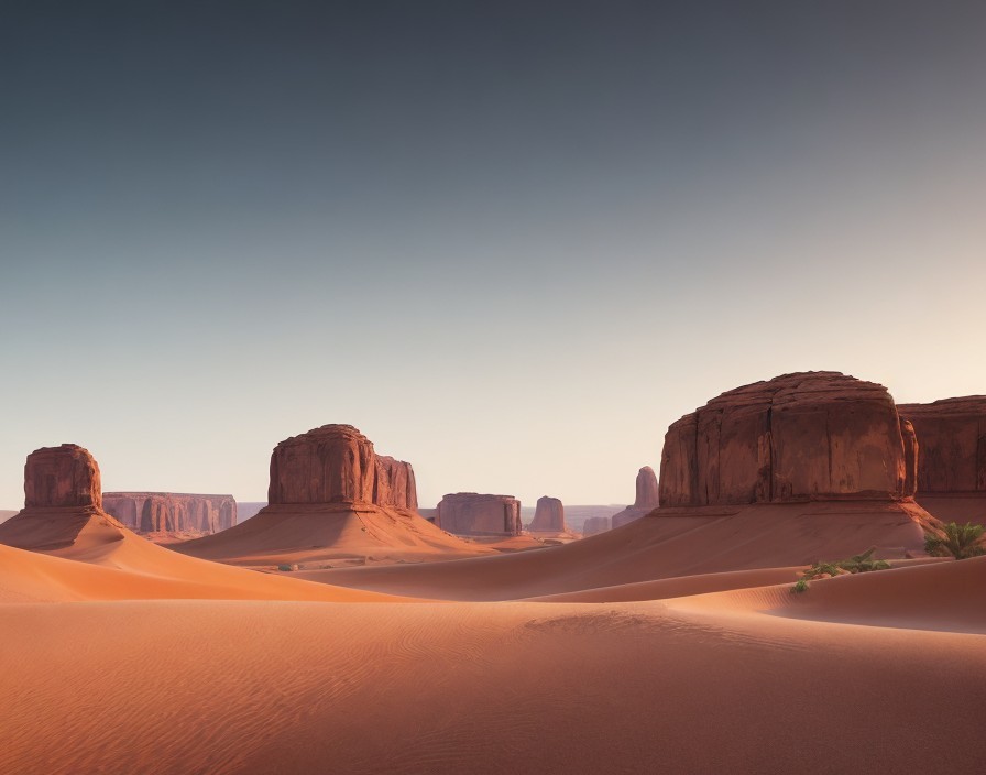 A serene desert landscape with sand dunes and rock formations under a soft-hued sky at twilight.