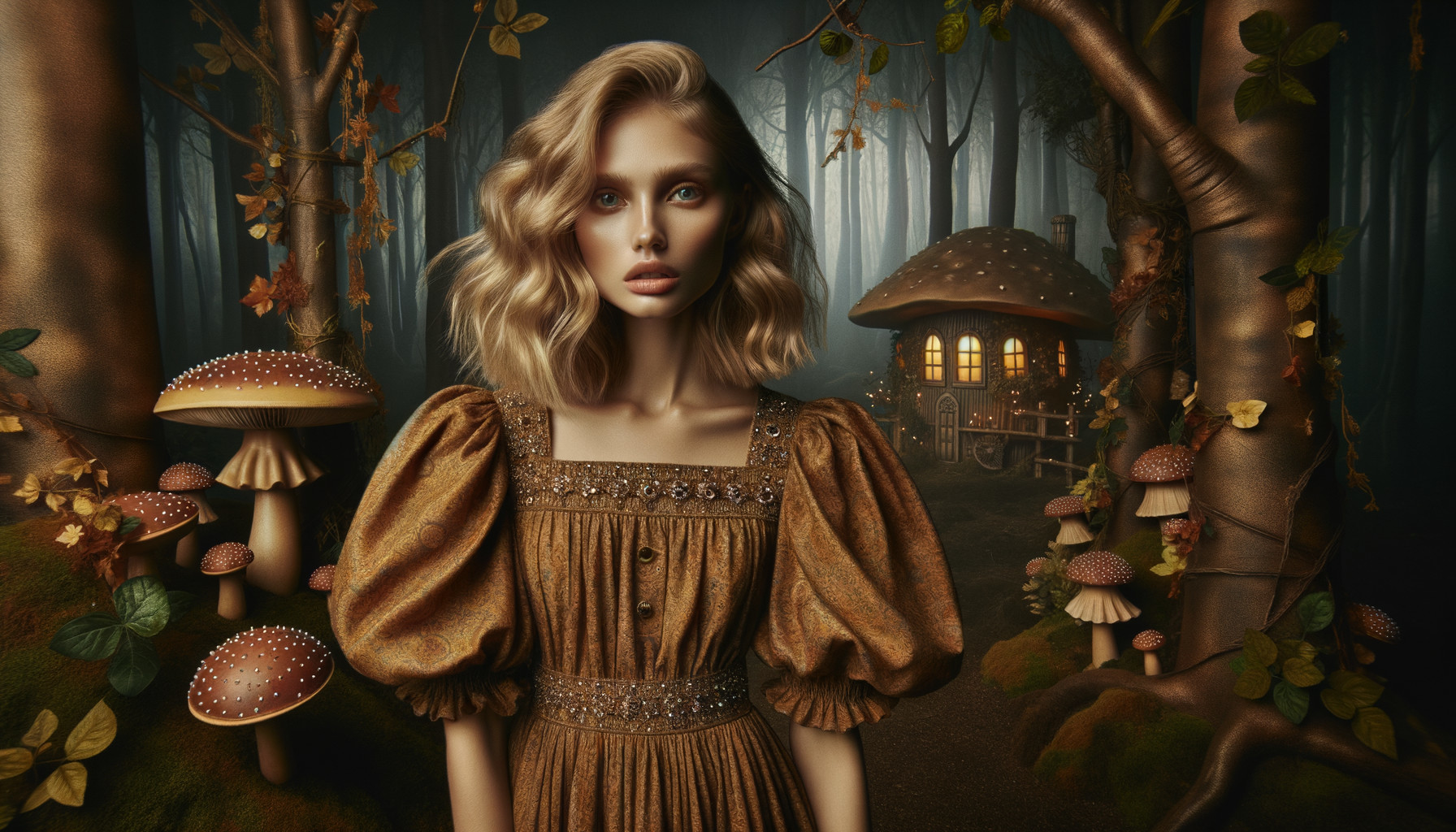 Prompt: "Create an image of a young woman with fair skin and striking blonde wavy hair that cascades down her back. She is clad in a whimsical golden brown dress with puffed sleeves and adorned with subtle intricate patterns and tiny glistening embellishments. The dress cinches at the waist and flares into a knee-length skirt, reflecting a rustic yet enchanting style. Her facial features are soft and delicate, with downcast eyes, full lips slightly parted, and an elegant nose, embodying a dreamy, contemplative demeanor.