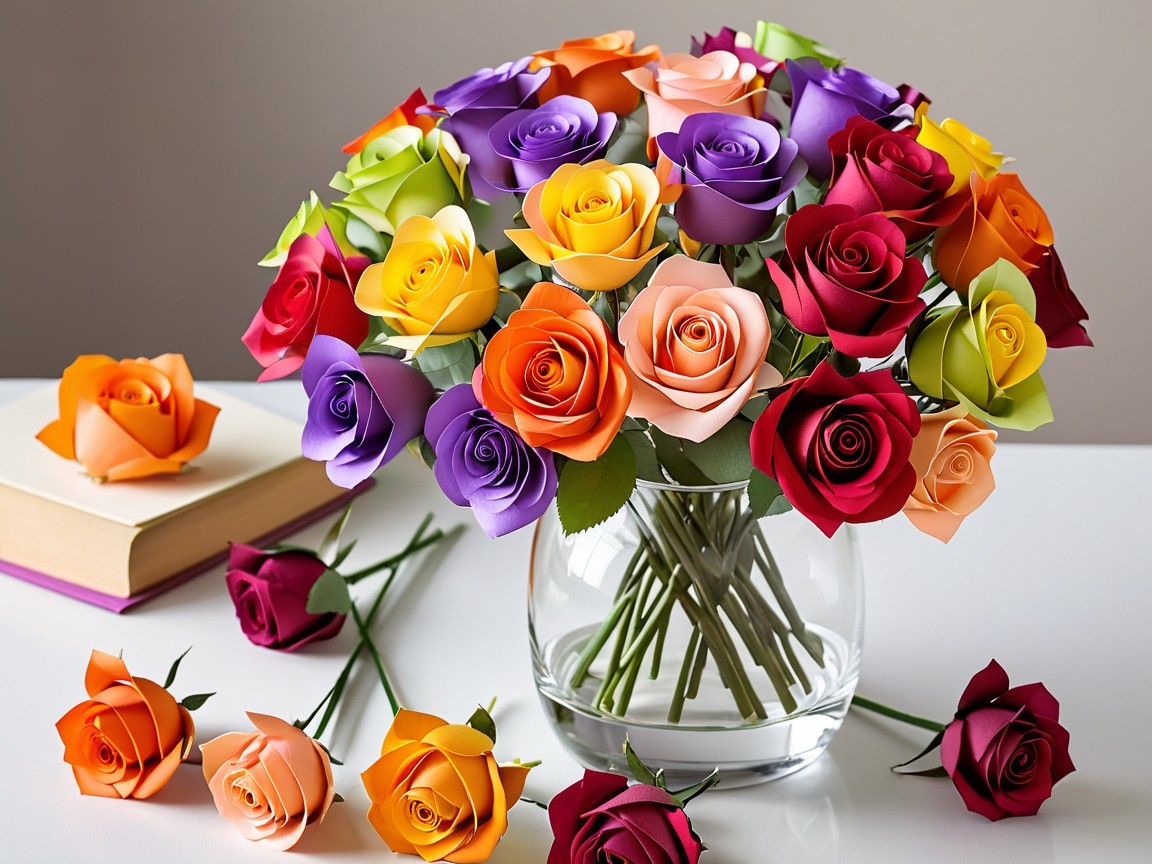 A vibrant bouquet of multicolored paper roses, crafted from various shades of red, orange, yellow, pink, purple, and green paper, fills a clear glass vase positioned to the right of the frame on a white table. The paper roses exhibit meticulously folded petals, replicating the intricate details of real roses.