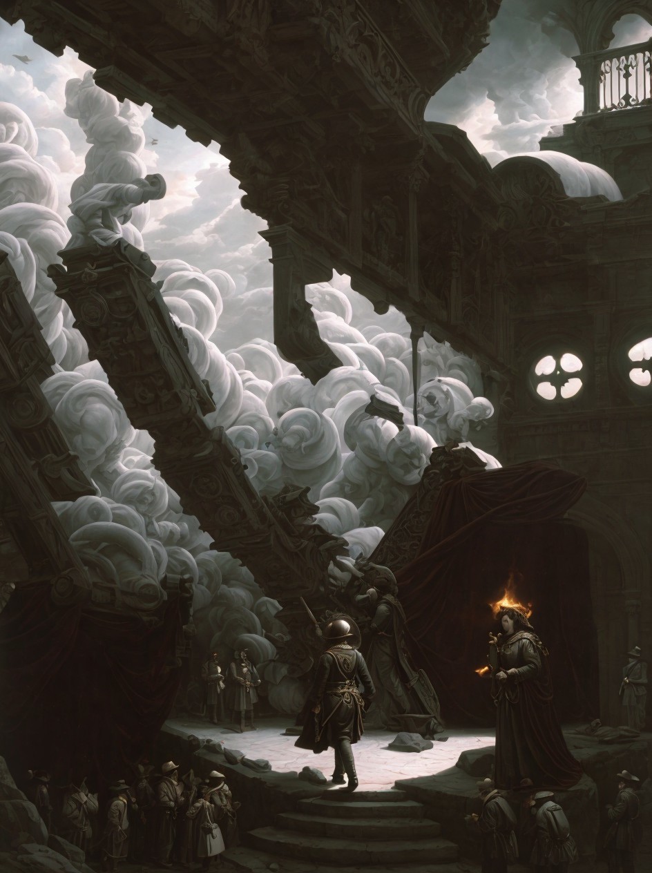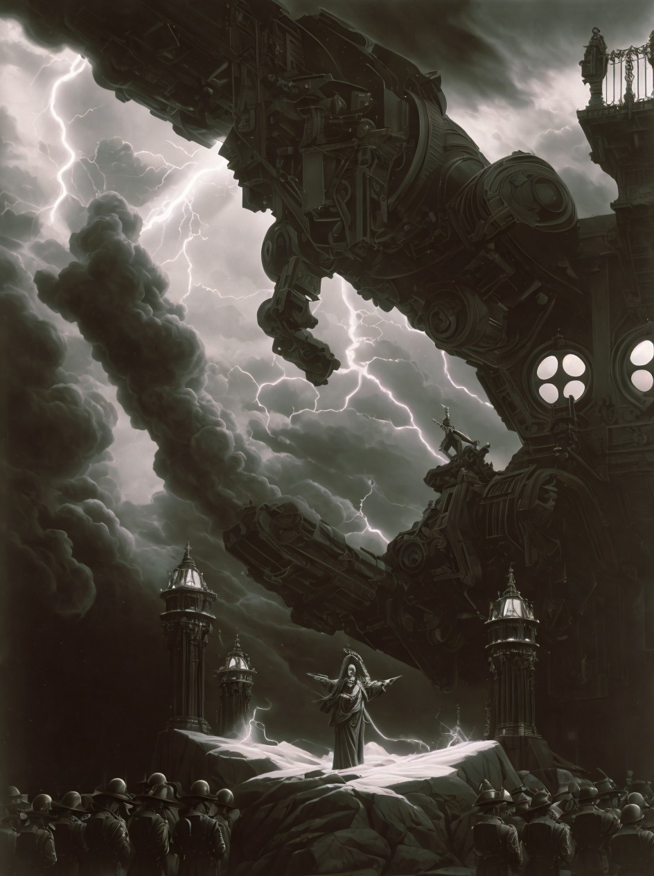 Prompt: doomed ritual - harbinger - tragic sacrifice consciousness of thunderous resonant radiating megaton lightning - you creep up like the clouds and you set my soul at ease, it's evil, babe, the way you let your grace enrapture me