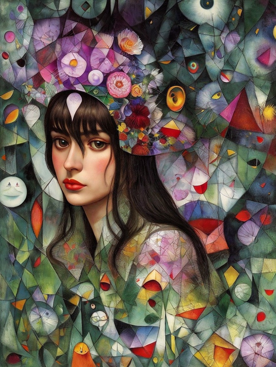 A surreal portrait of a woman with an oversized, reflective head surrounded by floating bronze spheres against a moody backdrop.prompt by Sue.