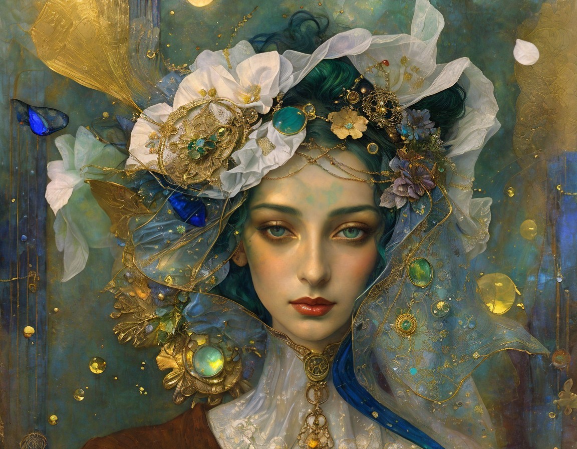 A captivating portrait of a young woman with curly hair adorned with a large white flower and green leaves, set against an abstract green background, exuding an ethereal and serene aura.