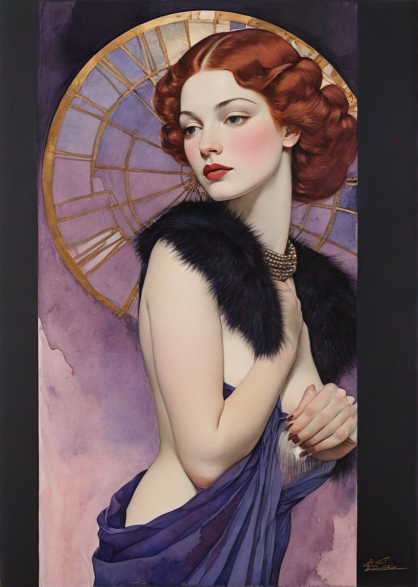 whimsical, beautiful, poignant, touching. colors pink, violet, gold, rust, indigo, burgundy, black. soft watercolor extra water in Art Deco by Annigoni, Egon Schiele, Milo Manara, Botticelli, Catrin Welz-Stein, Jean Metzinger, Klimt, perfect eyes, perfect hands face , highly detailed, complementary colors, hyper detailed. Watercolor and ink splatter, dynamic pose,