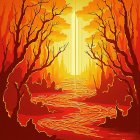 A vibrant autumn landscape features tall, silhouetted trees with fiery orange leaves. The scene is illuminated by a bright sun, reflecting in a calm river that runs through the vivid colors.