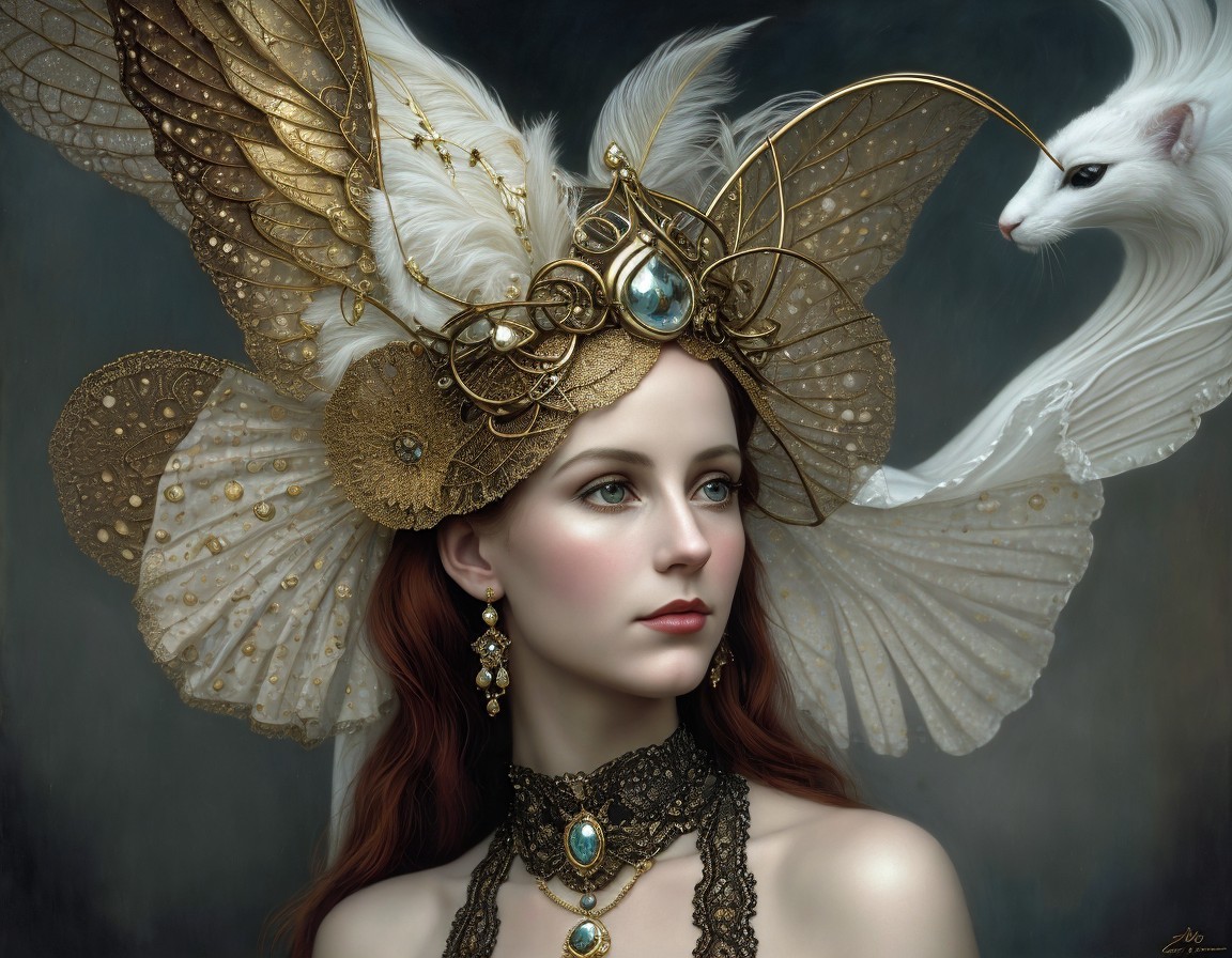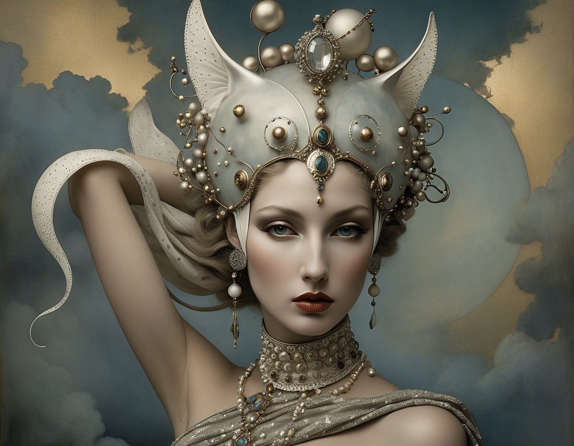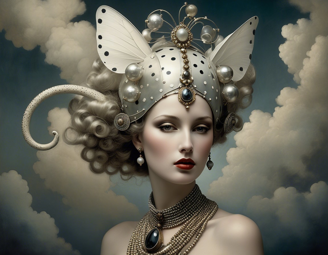 A striking portrait of a woman adorned with a dramatic headpiece featuring feathers and metallic elements. Her elegant curls and bold makeup enhance the ethereal, dreamlike atmosphere.