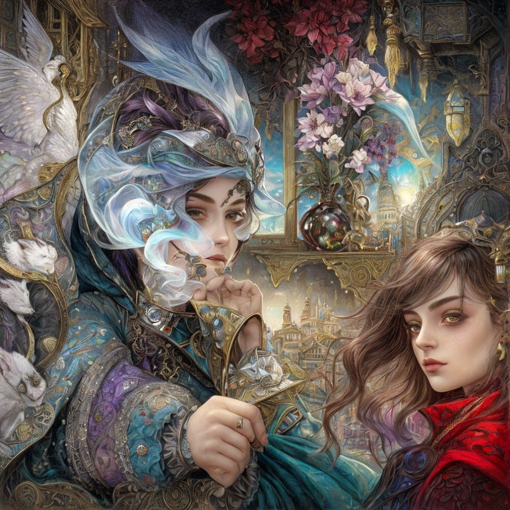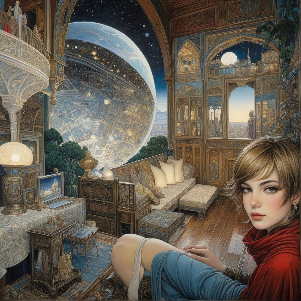 A beautiful woman sits by an ornate window, gazing out at a moonlit city. Richly decorated with lanterns and plants, the scene blends elegance with a tranquil night atmosphere. Based on prompt by Xrx.