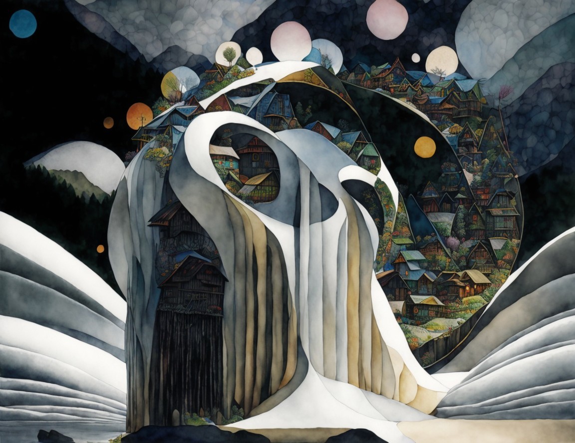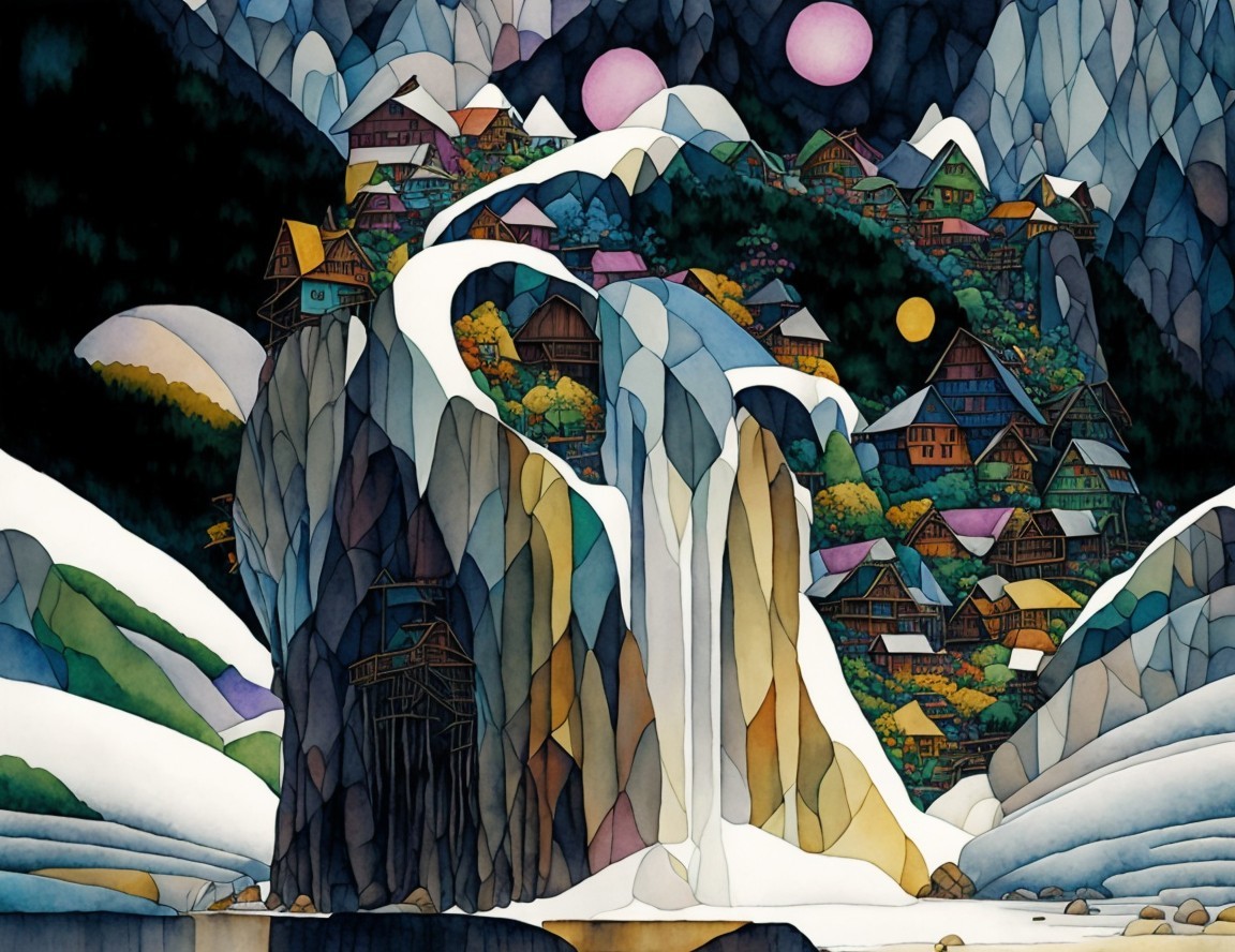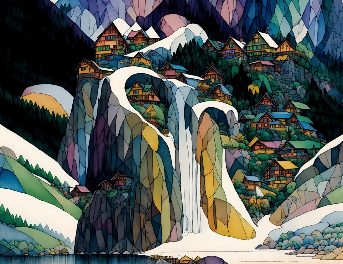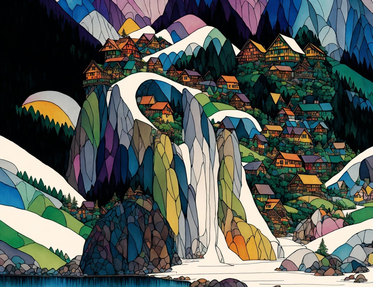 Colorful, stylized illustration of a mountainous village with vibrant, geometric cliffs and a serene waterfront.