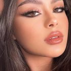 The image features a close-up of a woman with flawless skin, highlighted cheekbones, and striking winged eyeliner. Her full lips have a glossy finish, and her hair flows beautifully, enhancing her radiant look.