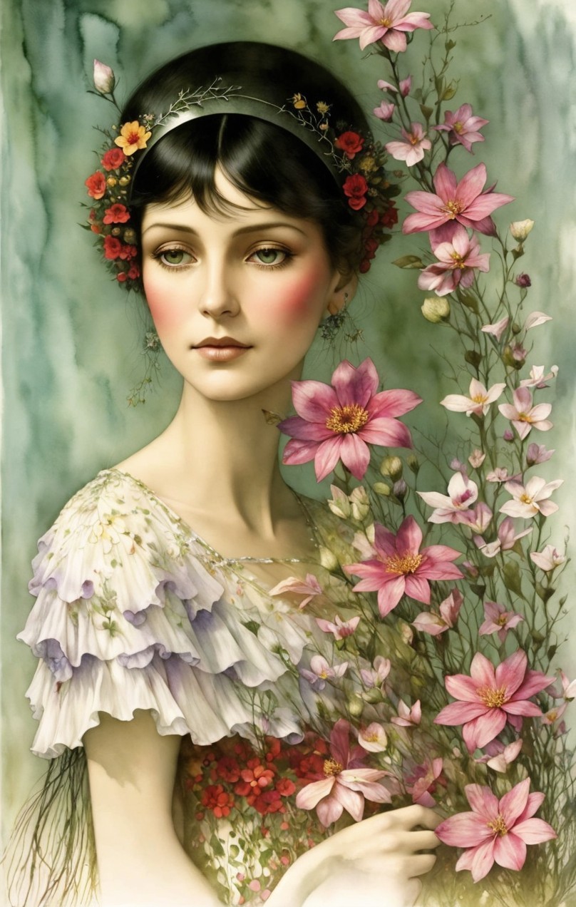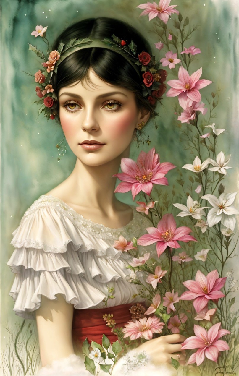 Young woman portrait with serene expression and floral adornments.