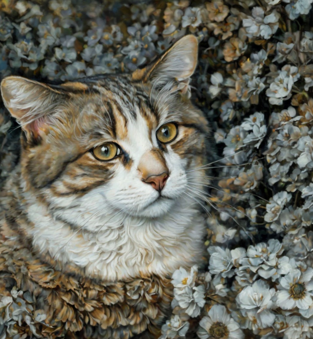 + Prompt:Artistic dynamic watercolour of a beautiful brown tabby cat with golden eyes striding towards the viewpoint, EthierUnreal V1 enhanced, enveloped by Macabre 1.0 aesthetics, surrounded by a stunning bloom of black ink coupled with metallic paint splashes, represented in a 16k resolution masterpiece of 64 megapixels, cast in elegant yet dark fantasy concept art, a current trendsetter on Artstation, meticulously etched in hyper detailing and hyperrealism