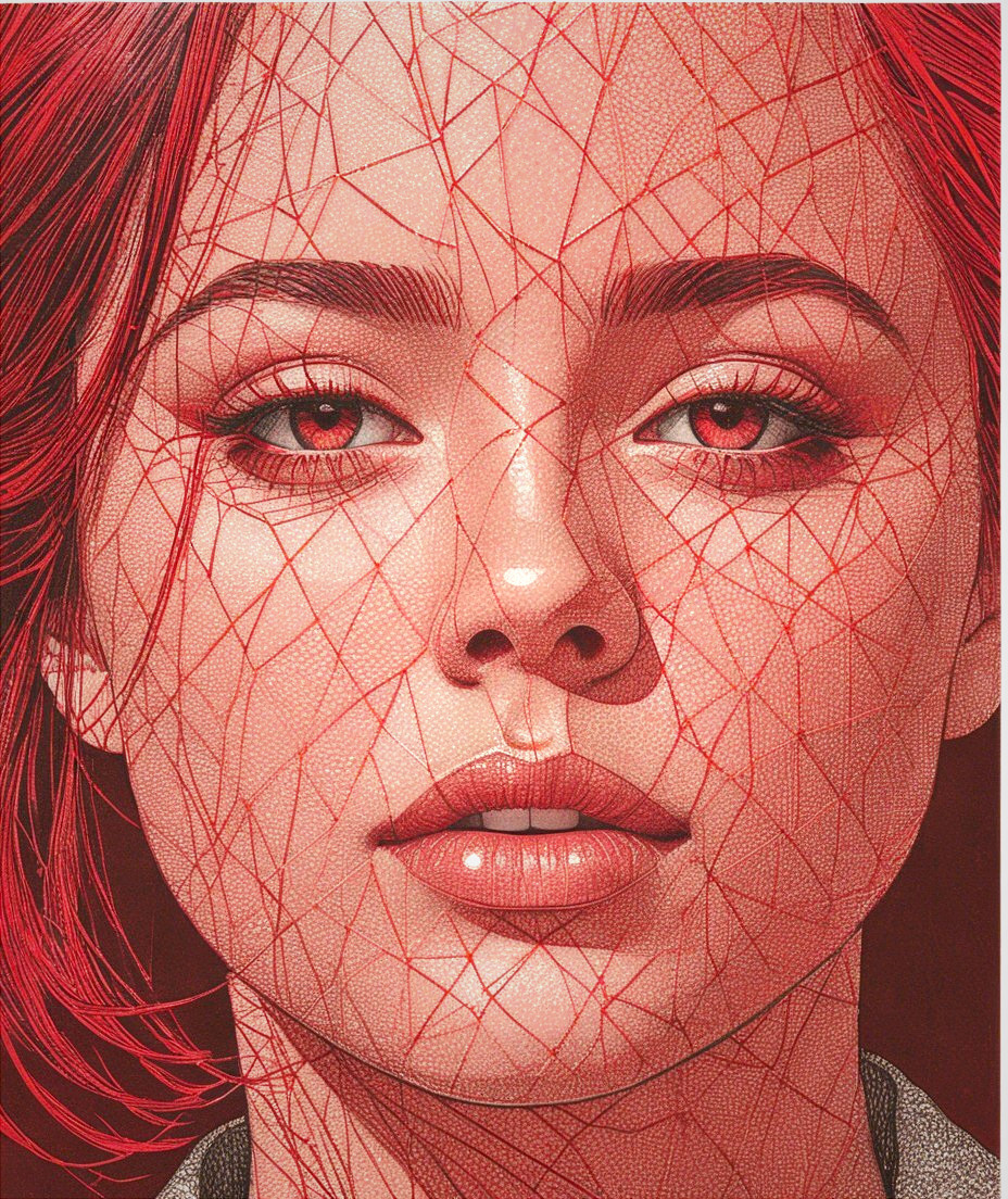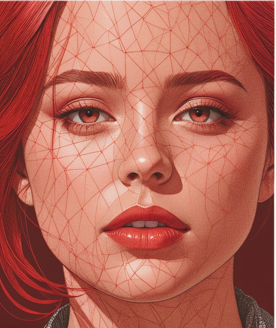Juvenile female headshot, opaque details, sharp, linework, glossy, line-art features, simplistic coloring scheme, grain, dappled, dynamic lines and subtle circular patterns, metallic red, suggesting agility and movement. delicate grain, gridded, squiggly line-art, baroque, technical collagraphy merged with giclée print, enchanted female, dystopian collage art, fine lines, triadic color scheme rosewood-pink light-red auburn, collagraphy reminiscence, hues by Ho Baron, overall composition by Ed Binkley, indiecore, asymmetrical, tall and lean details, intricate geometries, mixed media masterpiece, vibrant art-nouveau color tones, gradient inking colors, angled view showcasing seductive expression, fine-line style in awesome tessellated industrial design with a stylized linework, nuanced painterly, complex coloring reminiscent of fine-line art,