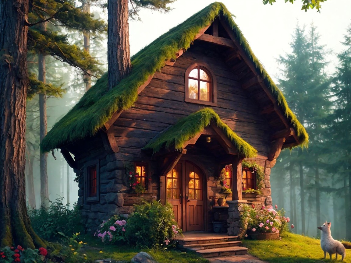 A charming log cabin tucked in a misty forest, featuring a vibrant green, moss-covered roof. Surrounded by tall trees, it exudes a whimsical and cozy atmosphere with flower pots by the door.