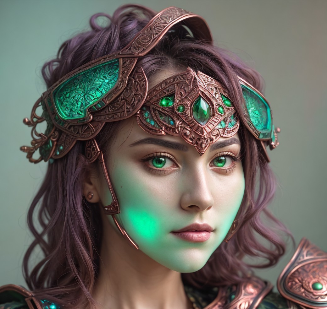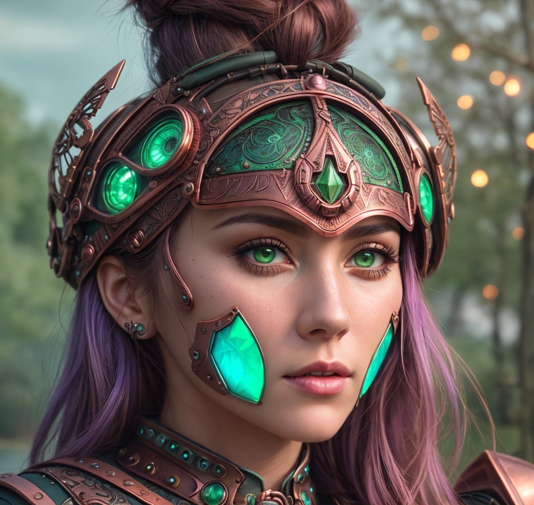 Mosscore, female face, steampunk, detailed armor with copper details, riverine background, green lighting, intricate beauty, encaustic strokes (gorgeous zentangle surrounding, (bright illustrative lines, (triadic color scheme green blue reddish-brown ) 19:15), blueish copper 6:4), hues, Lavender tones 0.75 , insanely detailed curly hair, biomechanical details, tints of 1970s advertising art, acid spill, embossed strokes, inkpunk,  pointillism essence, colorful iridescence , volumetric lighting,  plushy psychpomp scene, fantastical charisma, luminous iridescence, mechanical fittings, psychedelic psychpomp, metallic appearance, octane render, luminous iridescence, mechanical details, vibrant colors,tints of fauvistic style, folded paper style , steampunk illustration, ghostly, beautiful illustrative art, realistic eyes, metallic fittings with Schreger lines, grisaille , anatomical details, metallic texture,, mist, hues, highly chipped background, volumetric lighting tints of gothic fantasy, psychedelic psychpomp scene, intricate ornamental copper details, amber rim lighting, acid spill, highlighted reflections in silvery watercolors,