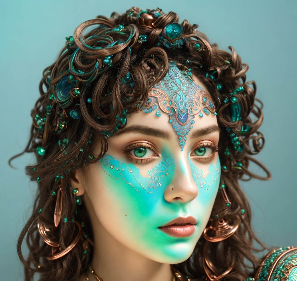 Moscore, ornamental portrait, female face, detailed armor with copper details, blueish lighting, intricate beauty, encaustic strokes, (gorgeous zentangle surrounding, (Creamy illustrative lines, (triadic color scheme green,blue, brown,) 9:5), blueish copper 6:4), Lavender tones 0.75 ,insanely detailed curly hair, biomechanical details, tints of 1970s advertising art, acid spill, embossed strokes, inkpunk, pointillism essence,  colorful iridescence and volumetric lighting, plushy psychpomp scene
