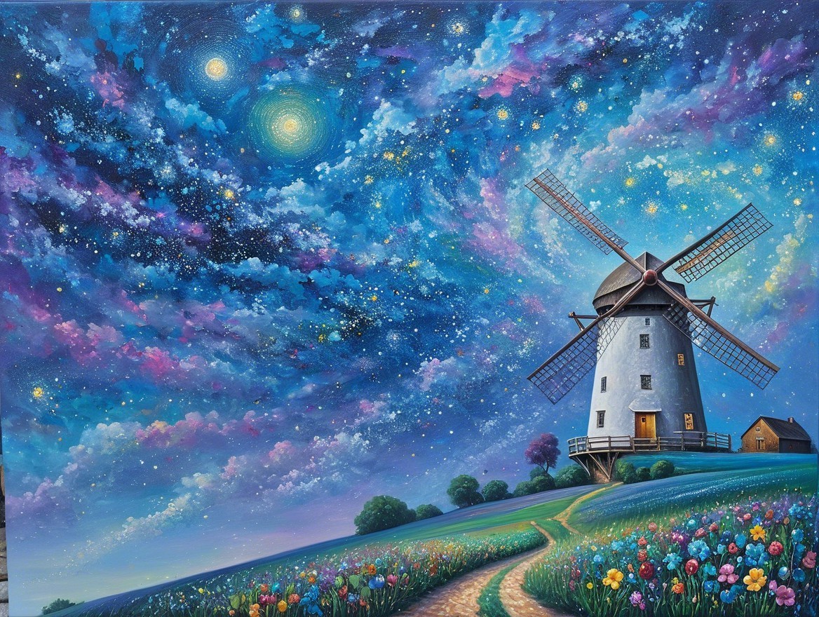 A vibrant, colorful landscape featuring a whimsical windmill against a swirling night sky. Bright flowers line the path, while stars and a radiant sun create a dreamlike atmosphere.