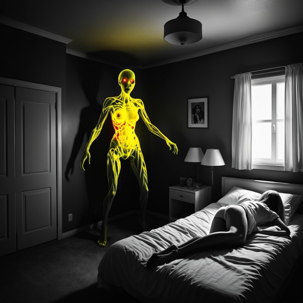 A glowing yellow figure stands in a shadowy bedroom, while a woman lies in bed, seemingly unaware. The eerie contrast highlights the figure against the dark, calm surroundings.