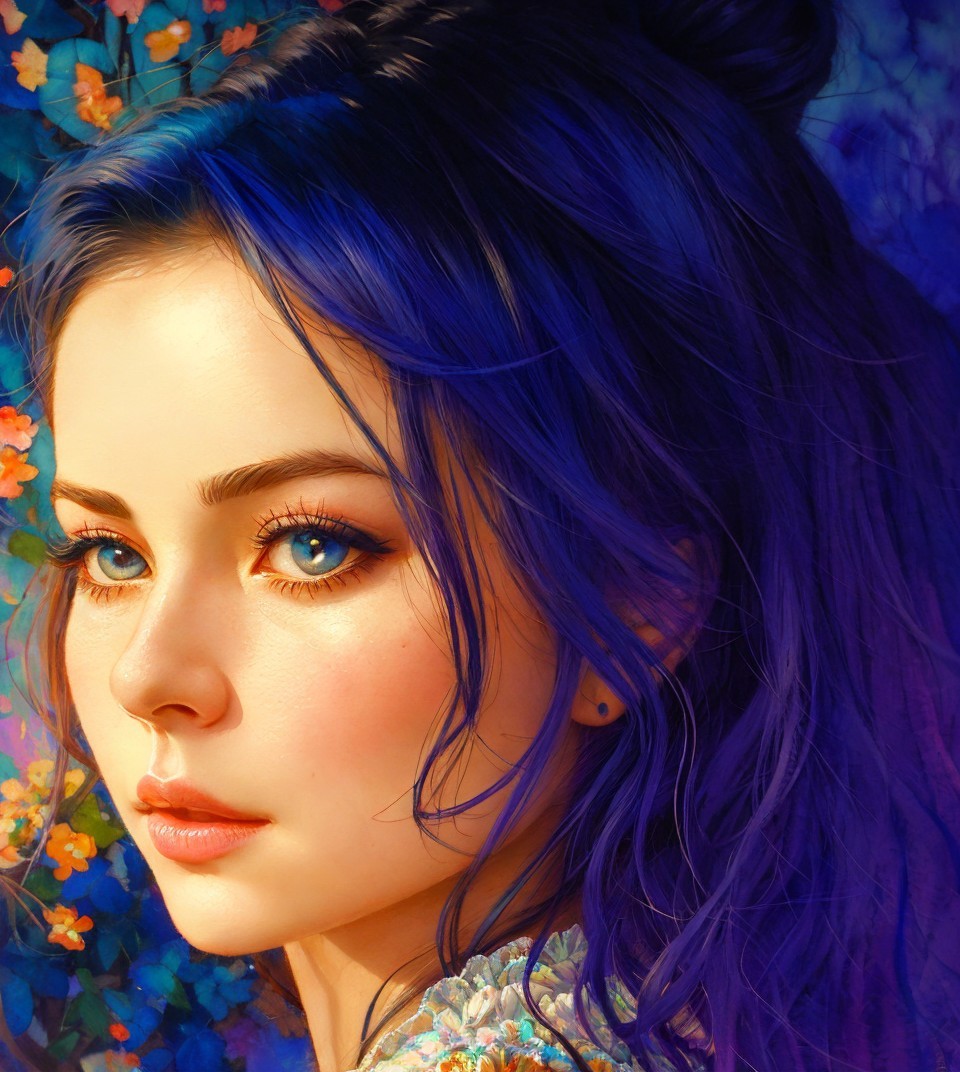 Stylized Woodblock print merged with storybook illustration, portraiture, stylized illustration, stacked-up perspective, beautiful female enchantress in blue frilly blouse with crackles, crochets, headshot in style of Georgia O'Keeffe and Didier Lourenço, realistic devilish eyes, dynamic lighting 1.3, hues, grunge,style of Waterhouse, Arlie Opal, Carne Griffiths, Stylized watercolor details, stunning, intricate ,meticulously , softened coloring, detailed close-up portrait, stylized face, watery alcoholic painture with dots and flares and splashes, soft rounded edges, back-lit, tetradic color scheme lilac beige blue purple, blue rim lighting, wavery paint, style of paint dripping technique, wet on wet painting, hues, gothic futurism, chiaroscuro lighting, ambient occlusion 1.5, shadow mapping 1.3, 3d effects 1.8, intricate stylized hairstyle, brightness 1.7, stylized zentangle lines, Anglo gothic 1.9, auracore, high coloring 1.9, mosscore 1.7, traumacore 1.2, retrofuturistic details of ornate, maximalism, radiance, brightness 1.4, tints of art nouveau illustration, 3d effects 1.8, shadow mapping 1.3, dynamic lighting 1.7, ambient occlusion 1.5, anisotropic filtering 1.9, raytraced shadows, ethereal, abstract style 1.7, hues, grain, blurry aura, fantasy movie still, synthetic essence, raytraced shadows, dark fantasy art, octane render illustration 1.5, auracore 1.7, stylized lineage surrounding, Schreger lines 1.7, serene, sensual, natural, delicate coloring 1.9, bokeh effects, beautiful composition 1.9, coffinwood 1.7, hues, grain, mist,