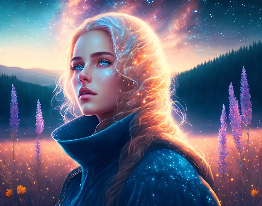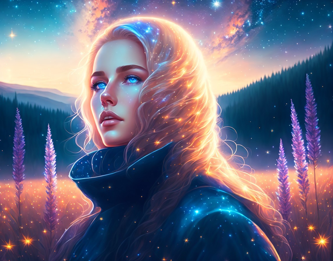 Digital Artwork: Woman with Golden Hair and Blue Eyes in Starry Night Scene