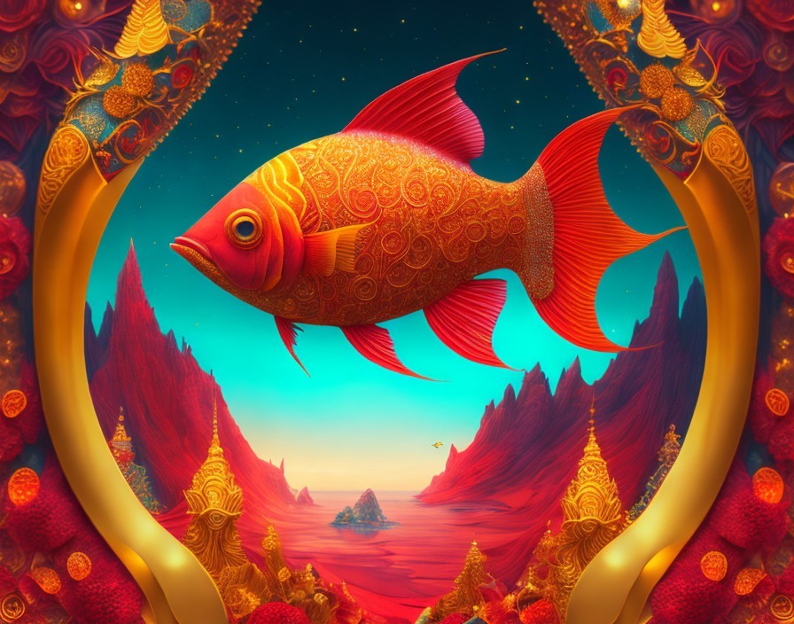 Prompt: Digital art, red yellow gold, fantasy fish, way, path, ultra-detailed composition, floating objects, intricate details, patterns, incredible landscape incredible, unearthly view, starlight, gas aura, abstraction, magic, style by Scott Bergey, Schim Schimmel, Tim Burton