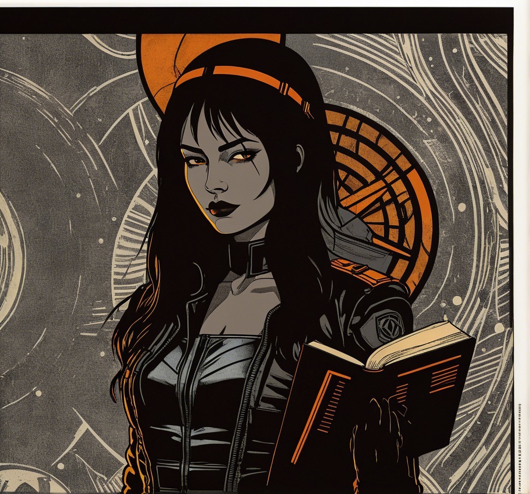 minimalist, style of outsider art, chilling, dark macabre atmosphere, Woodblock print, tints of 3d linocut, upper body portrait of beautiful female mercenary, frontal view, stacked lines, triadic color scheme brown orange yellow, magical realism,dark umbra,   book cover art, tints of marvel comic book art, dreamy, soft edges, intricate lineage by ho baron,  vibrant turquoise, green,deep blue, soft purple, hues by Gustav Klimt, lighting by Paul Klee, Stan Lee influence, strong intense outlines, saturated palette, tints of John Hoyland, coloring by Kim Keever, Foampunk style, champlevé watercolor technique, reminiscent of Arthur Rackham, Neo Rauch's impressionistic touch, Varo's  bold colors, spiritual dreamlike essence, Monet's intricate details, Chagall's sharp contrasts, Boulet's surreal elements, Jackson Pollock's abstract flair. details, reflections, parallax occlusion 1.5, great depth and scale, truculent, perfect handsface, cel-shaded, 7:5) tints of chibli art, rusticcore style, layered geometrical vector art, detailed style of patrick nagel and ho baron and Margaret Keane, intricate lineage, precise Gelsculpt 64K, tints of geometrical art, 3d effects 1.8, dynamic lighting, anisotropic filtering, brightness 1.4, visible textures, stylized illustration 1.8, vaporous auburn flares, stacked strokes, rule of thirds, ((chaotic background, 3d effects), radiance, brightness 1.9), spiritual essence, intricate background, detailed crackles, tints of Streamline_Moderne, stacked lines, stylized lineage, Schreger lines, Pastel colors 1.7, embossed strokes, raytraced shadows1.8, vibrant colors, high coloring 1.9, shadow mapping 1.9,rendered, xeroxed, octane render, cuteness, lavish, moody, synthetic, synthetic, Anglocore 1.9, auracore 1.7, high coloring 1.9, depth of field 1.7,
