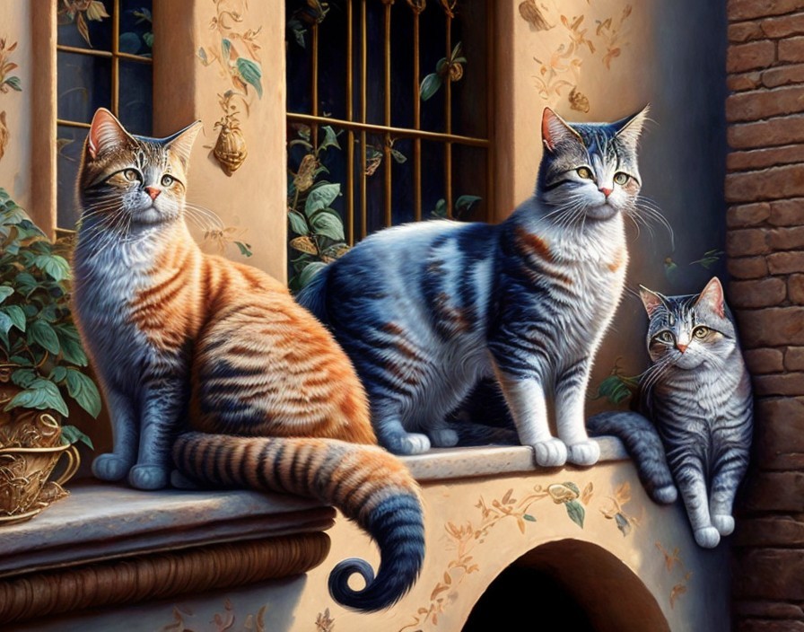 A group of variously patterned cats sits on a balcony with ornate columns, all looking intently in the same direction.