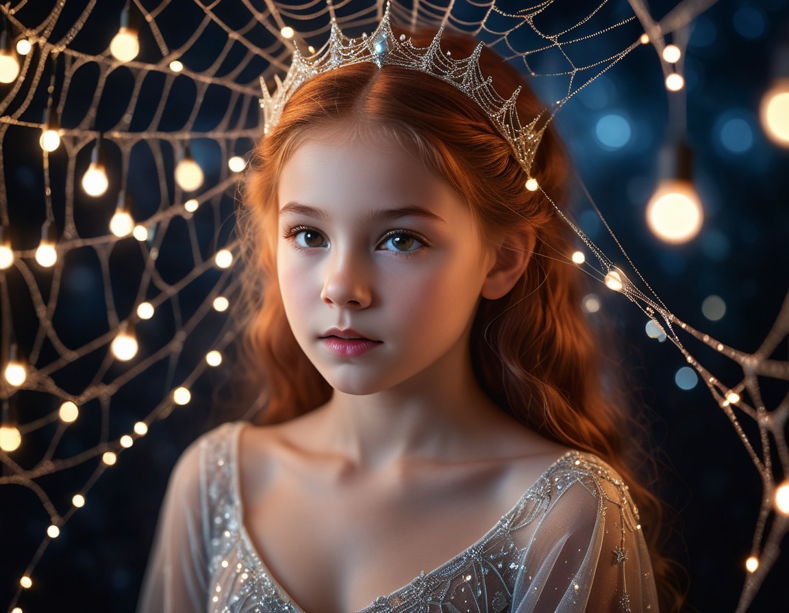 A young woman with wavy auburn hair, adorned with a jeweled crown, gazes serenely. She is framed by delicate spiderwebs and glowing fairy lights, creating an enchanting and ethereal atmosphere.