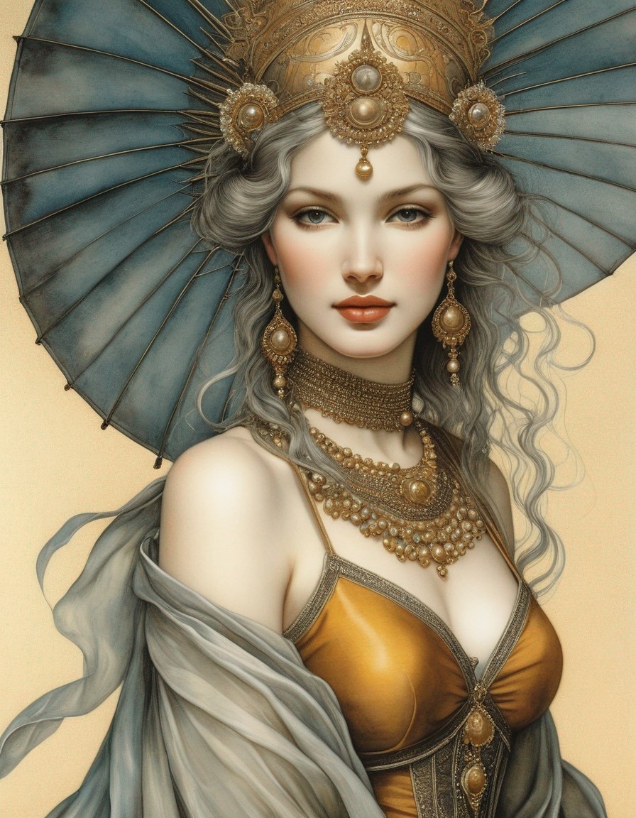 An illustration of a woman with ornate golden headgear, long gray hair, and an elegant blue and gold outfit, exuding a regal and mystical aura.