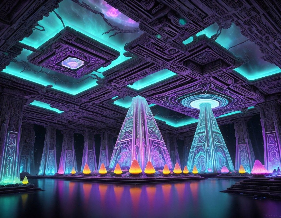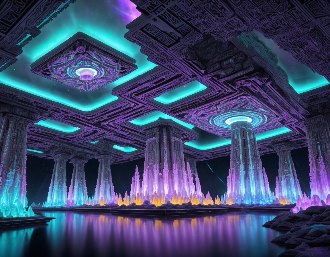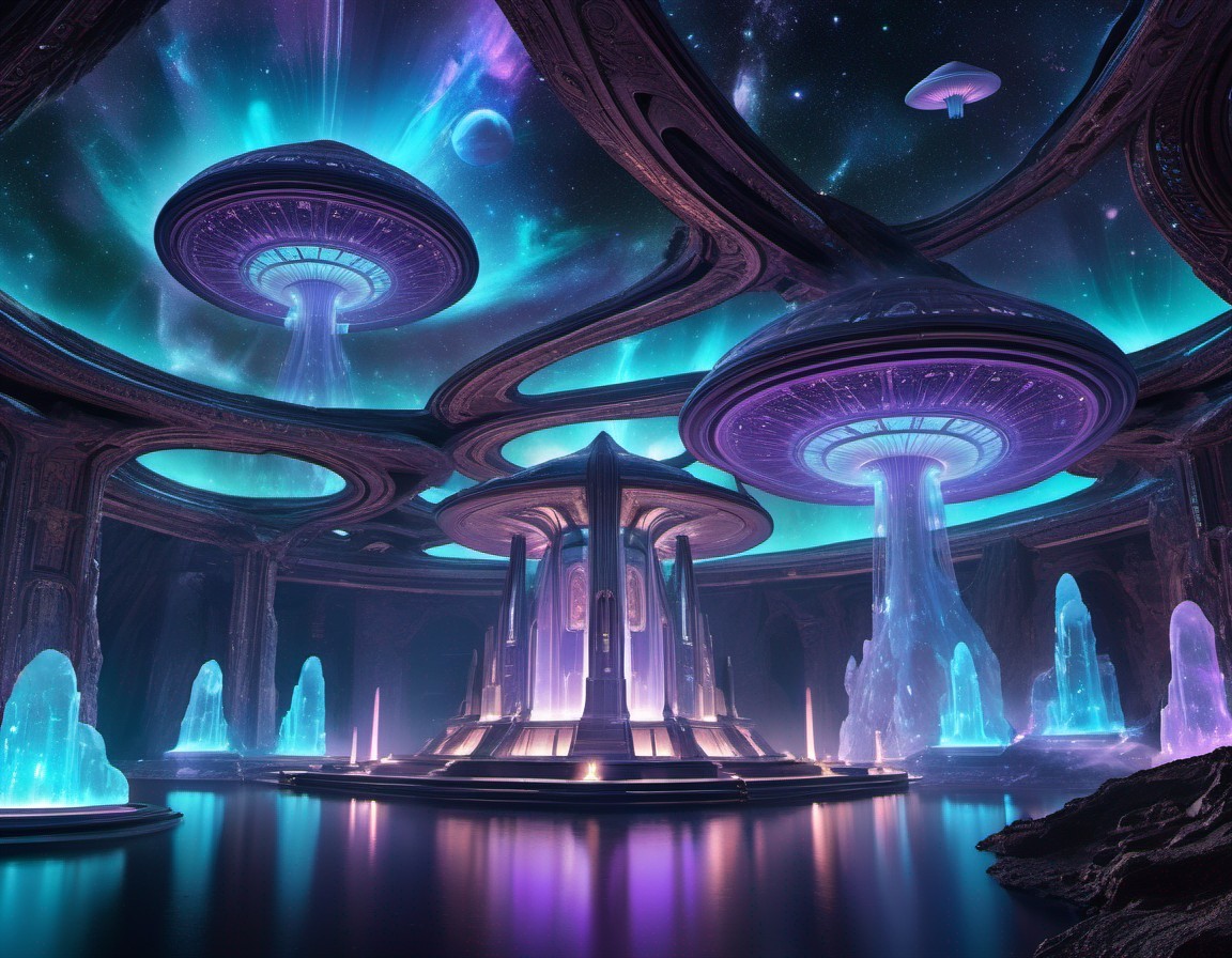 + Prompt:Extraterrestrial temple integrated with advanced alien technology, vibrant bioluminescent alien mushrooms scattered around, mysterious alien glyphs etched into the architecture, intricate sacred geometric designs adorning the structure, glowing crystalline minerals embedded in the walls, cosmic backdrop filled with swirling nebulae, distant planets, and galaxies, ultra-realistic landscape with a surreal twist, astral projection concept depicted subtly, alien contact narrative hinted at in the environment, surreal psychedelic atmosphere enveloping the scene. Capture a sci-fi LSD art aesthetic inspired by Cameron Gray's style, infusing mystical elements seamlessly. Ensure realism with hyper-detailing, intricate geometry, psychedelic colors pulsating throughout, galactic energy emanating from the temple, and cosmic LSD poster art vibes resonating in the composition.