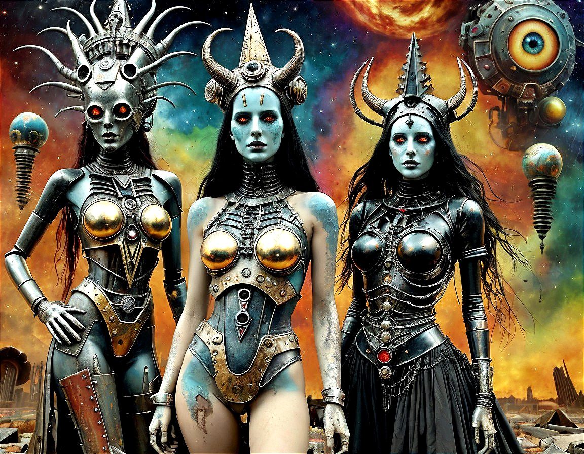 mixed media modern art. sensual witches of beauty with demonic horns, horror inspired. rusted robots on ground. Van Gogh fine art Marc Chagall, Amedeo Modigliani, Enki Bilal, demon eye in the sky, Horror themed, Stephen Gammell ,Rosina Wachtmeister cosmic astronomy photo background. Inspired by Aliens, Hellraiser, Androids and cyberpunk. intricate photorealistic high detail colourful , by Tim Burton, Ed Repka and Gustav Klimt