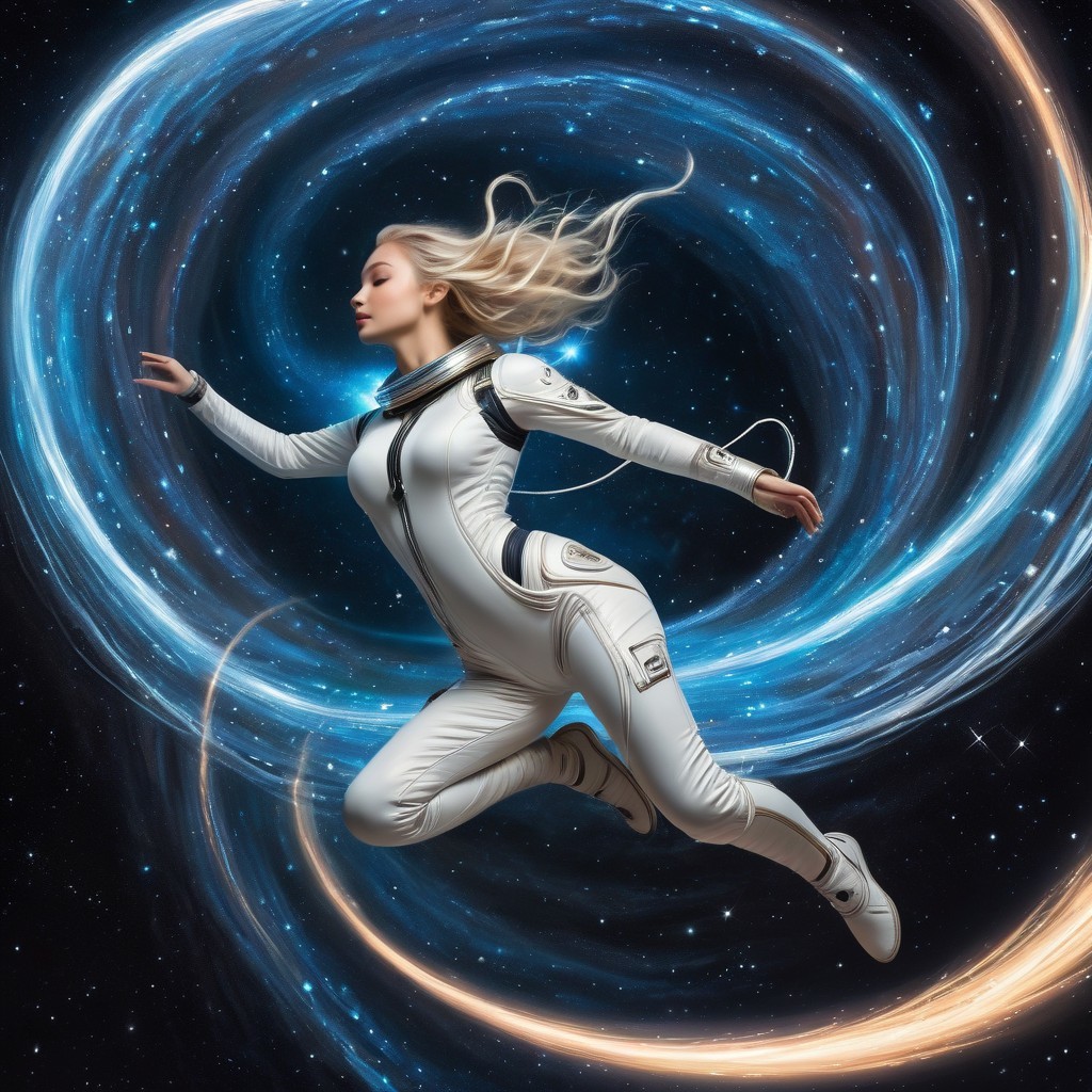 In the bioluminescent void of space, where supernovas and pulsars whirl, an ancient star-ship soars upon the edge of the milky way galaxy. A young extraterrestrial woman floats weightless within the void, dancing upon the whirling spiral of the galaxy, her spacesuit tethered by a swirling silver cable to the ancient ship. A dying sun illuminates the young woman, its radiance adding to the interstellar tapestry. Luminescent starlight reflects on the young woman, her hair ( Grim Fairy-tales Rapunzel) floating weightless around her, her eyes staring into the abyss in wonder.