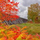 A stunning autumn landscape features a tall, wooden trestle bridge surrounded by vibrant red and orange trees. A serene river flows nearby, reflecting the colorful foliage and misty sky.