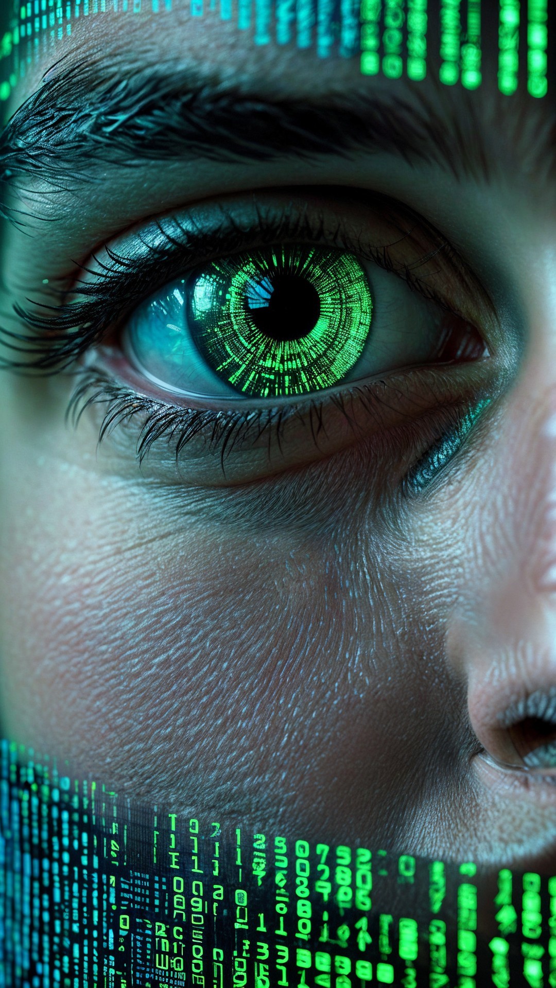 A futuristic robot with a sleek design and glowing, digital elements. Its visor displays intricate green code and patterns, hinting at advanced technology and artificial intelligence capabilities.
