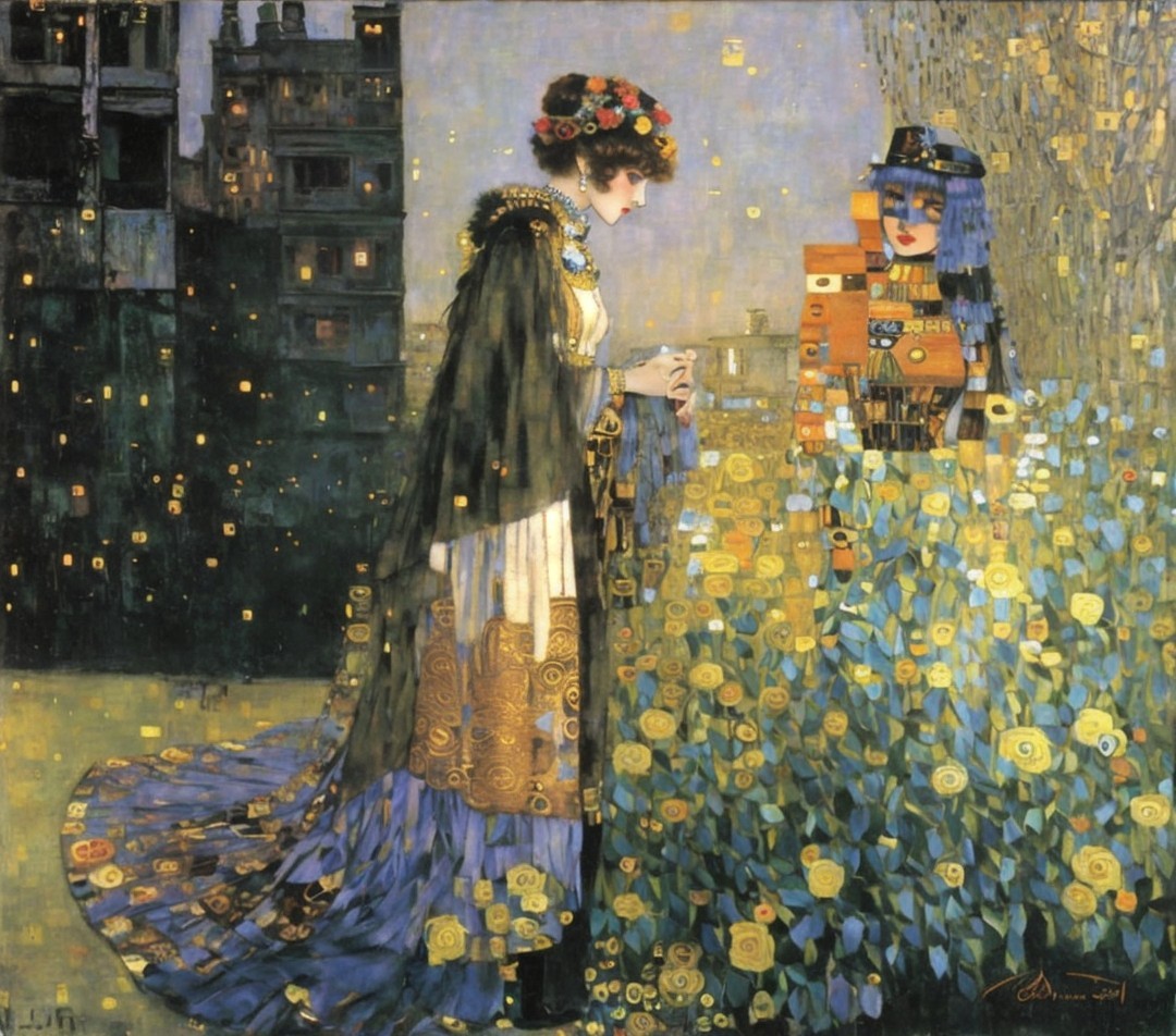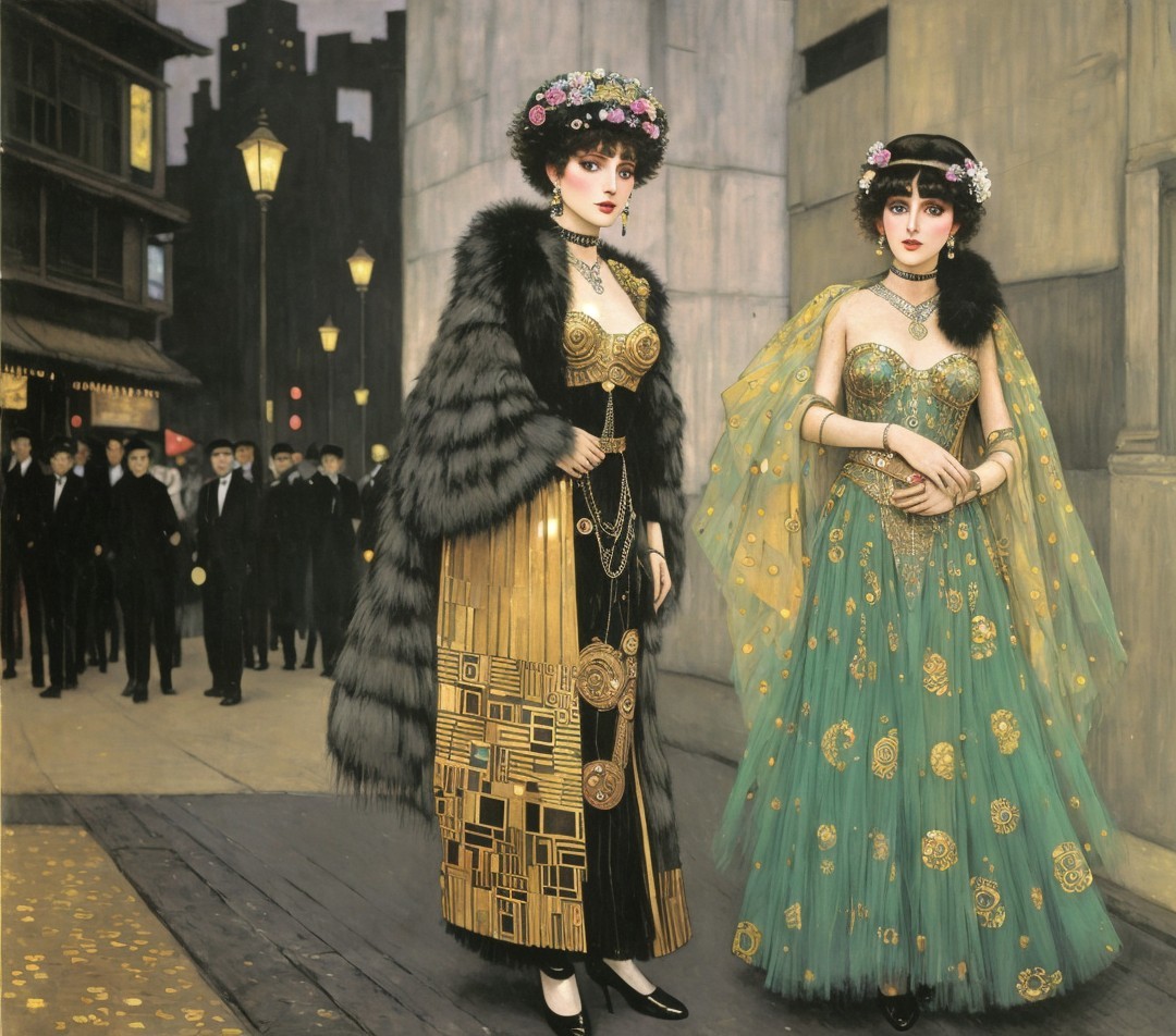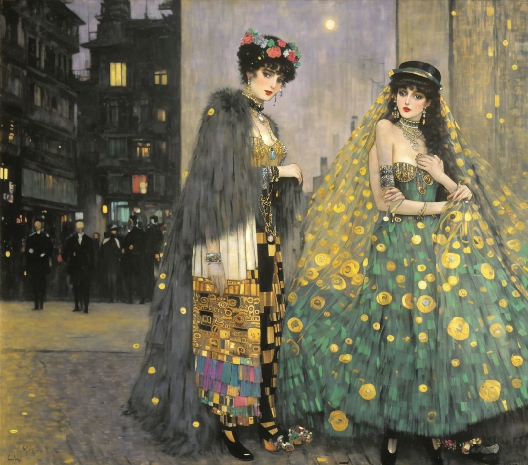Two elegantly dressed women stand on a dimly lit street, surrounded by figures in dark attire. One wears traditional attire with vibrant patterns, while the other sports a flowing, glamorous gown.
